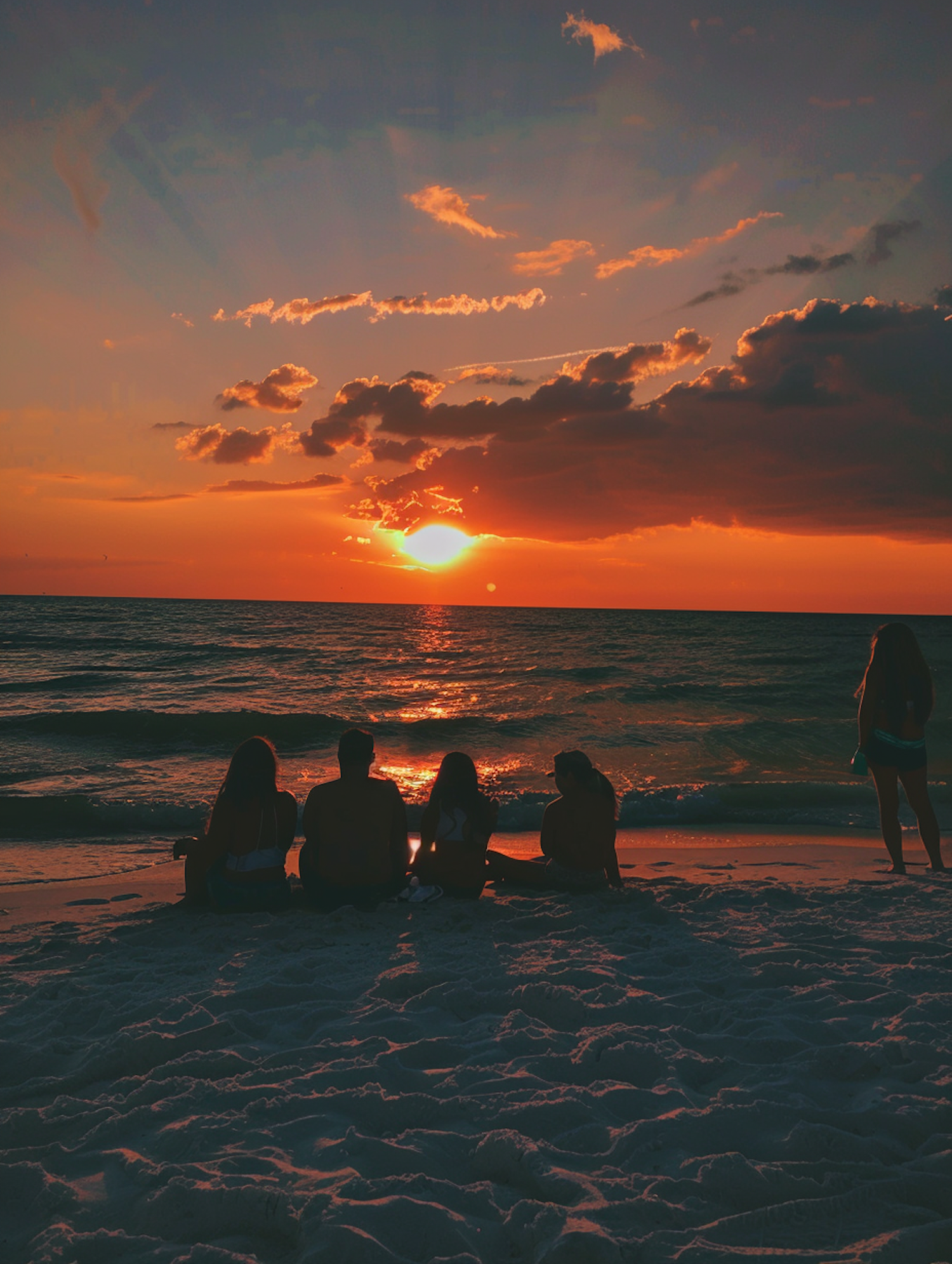 Silhouetted group on a beach at sunset, with vibrant orange sky and ocean waves. A serene and tranquil scene.