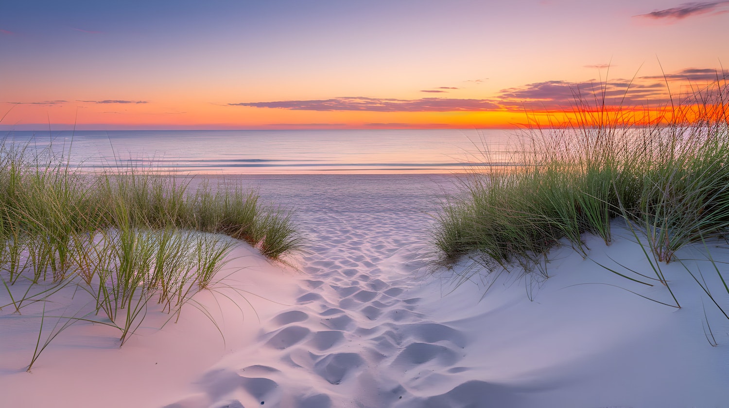 A tranquil beach sunset with soft sand dunes, green grass, and a serene ocean reflecting warm orange and pink hues.