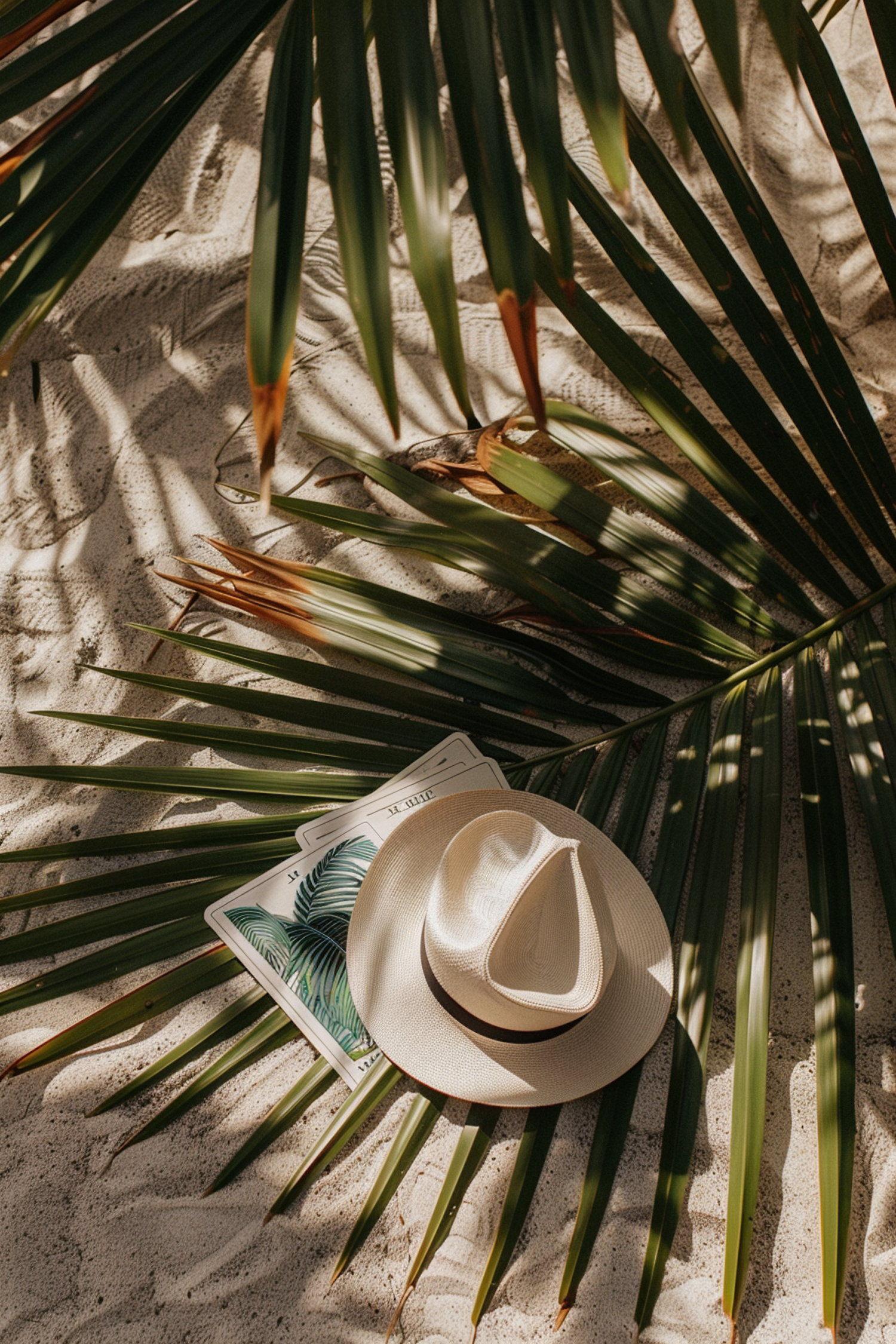 Straw hat and tropical magazine on sandy beach with palm leaf shadows, creating a serene and relaxing vacation vibe.