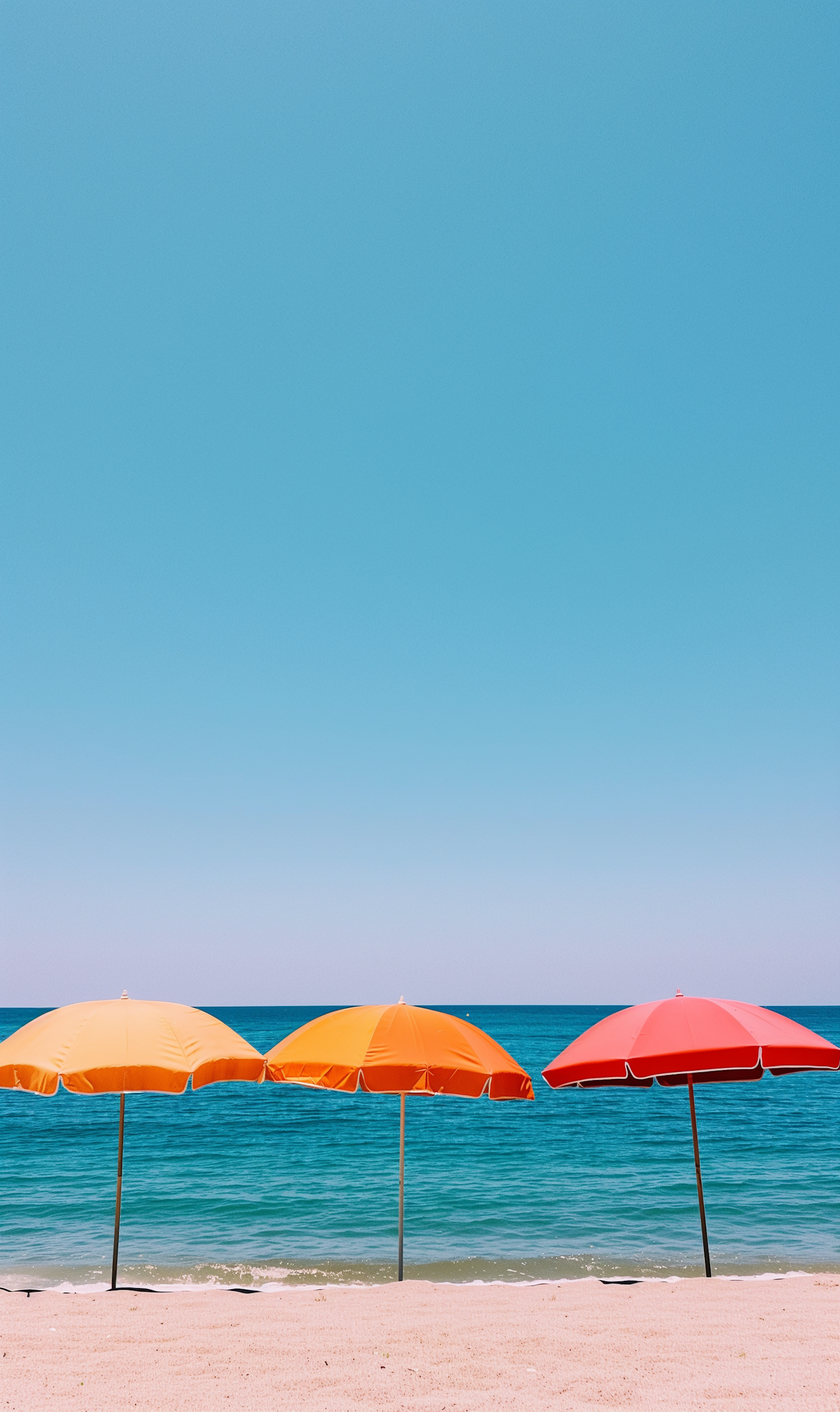 Colorful beach umbrellas on a sunny day by the sea, with clear blue skies and gentle waves on the sandy shore.