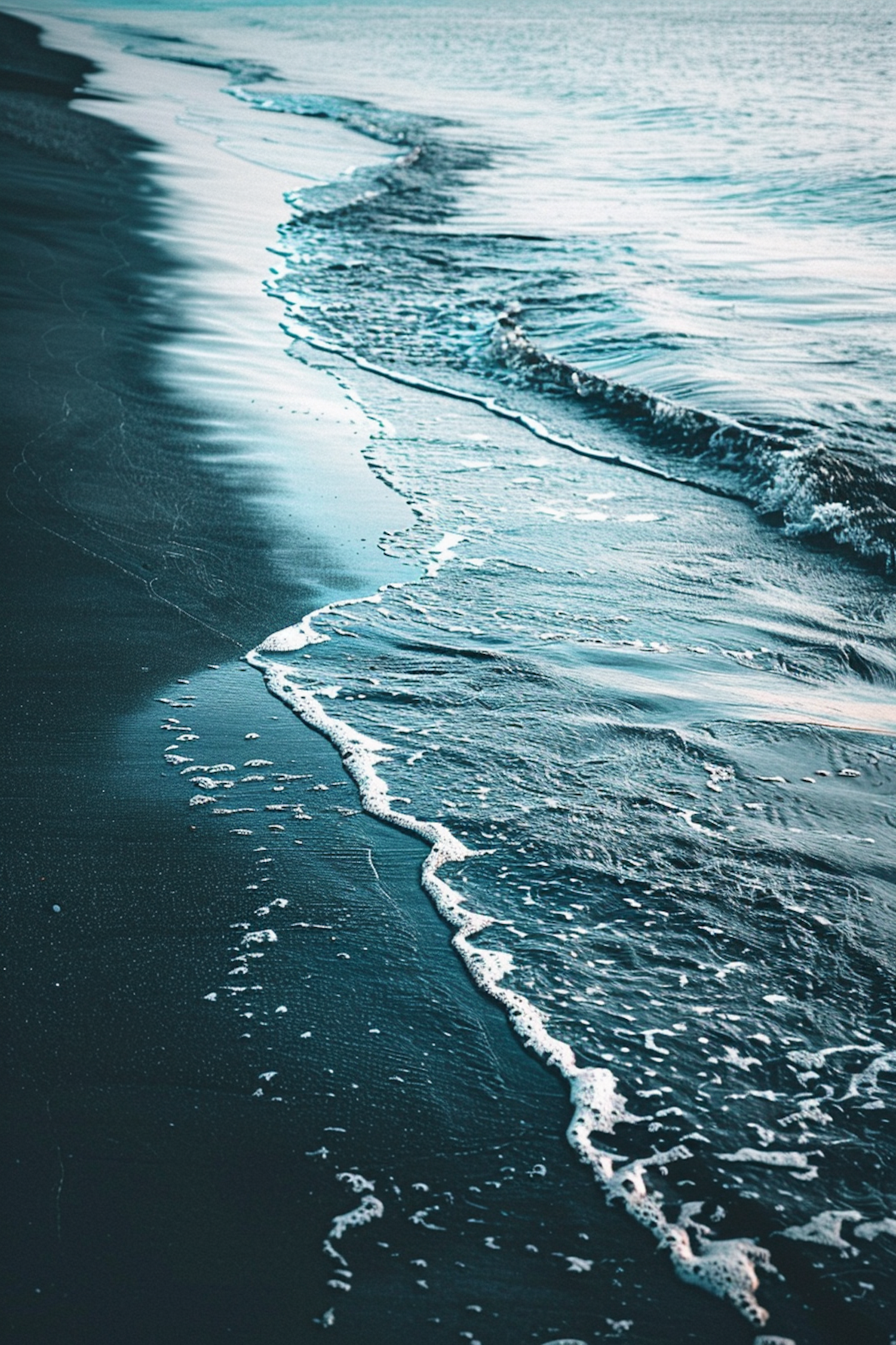 Serene waves gently lap against a dark sandy shore, creating a tranquil and calming coastal scene.