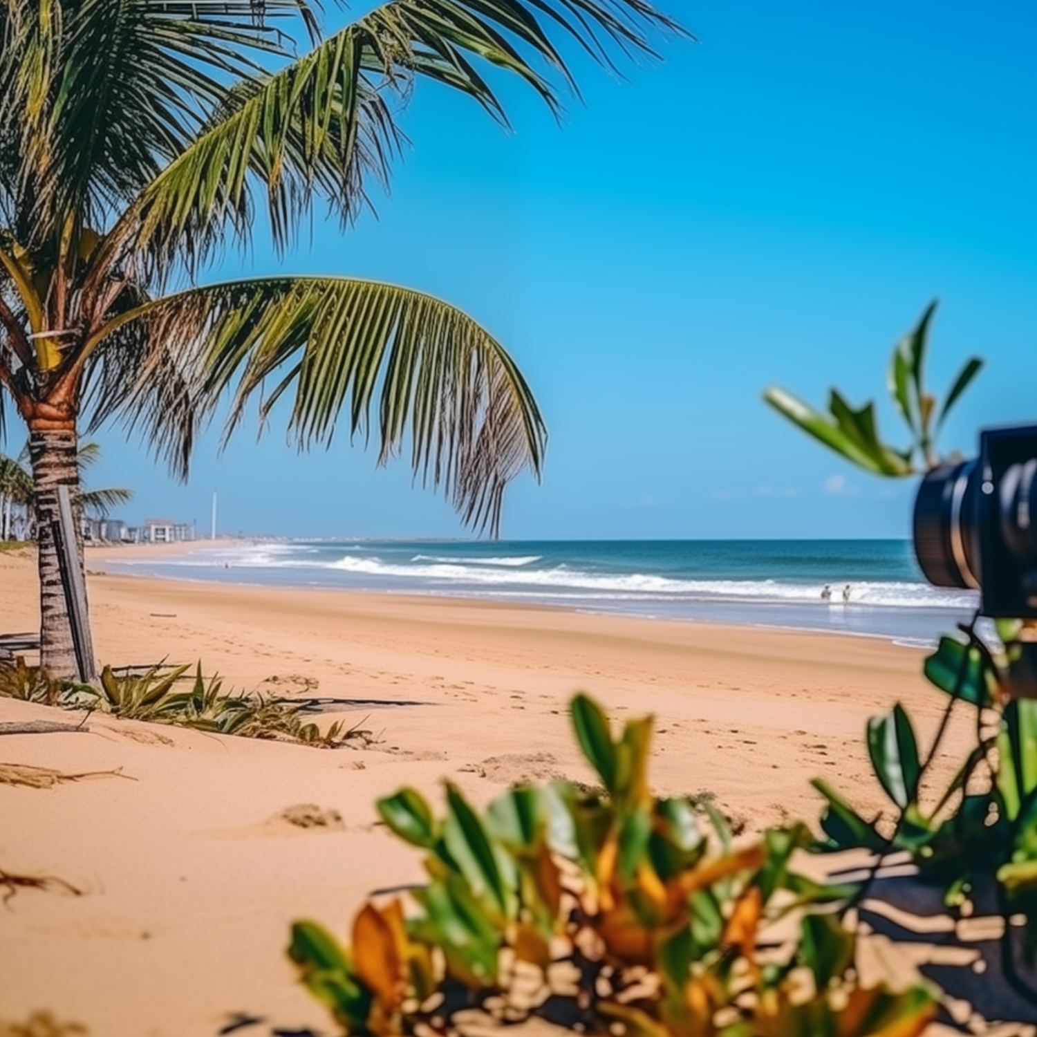Tropical beach with golden sands, palm trees, and a clear blue sky. A camera in the foreground captures the serene coastal scene.