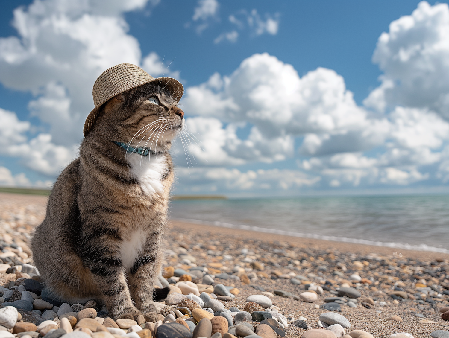 A tabby cat wearing a straw hat sits on a pebble beach, gazing at the ocean under a blue sky with fluffy clouds.