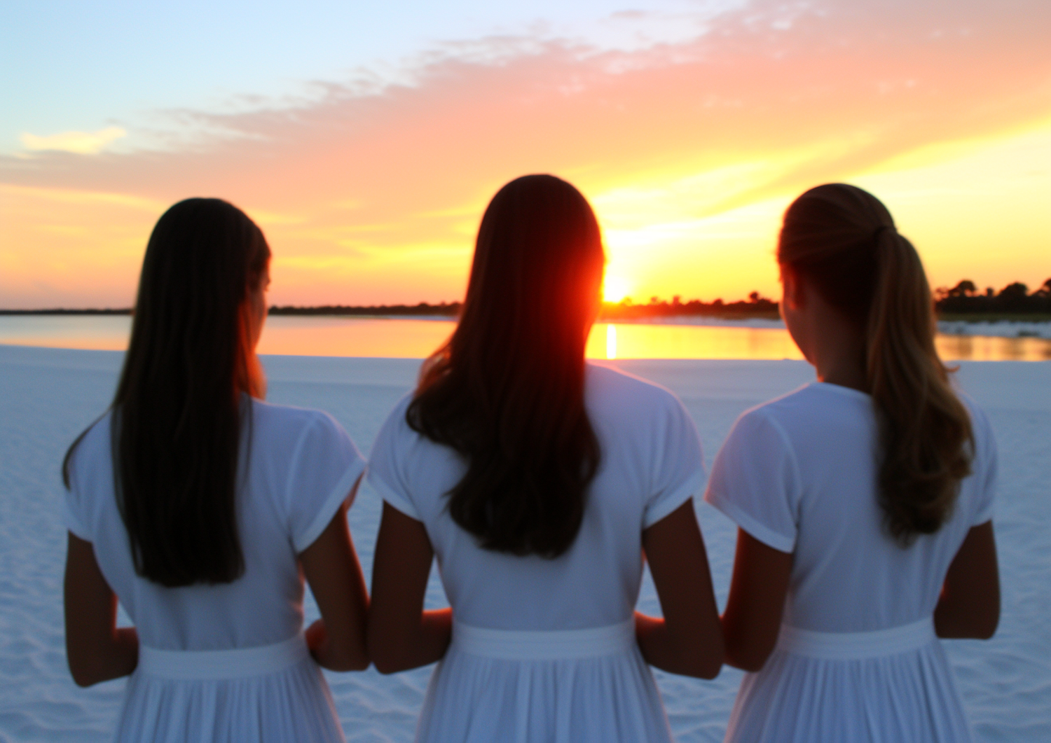 Three women in white dresses watch a stunning sunset over a tranquil beach, with vibrant orange and pink skies reflecting on the water.