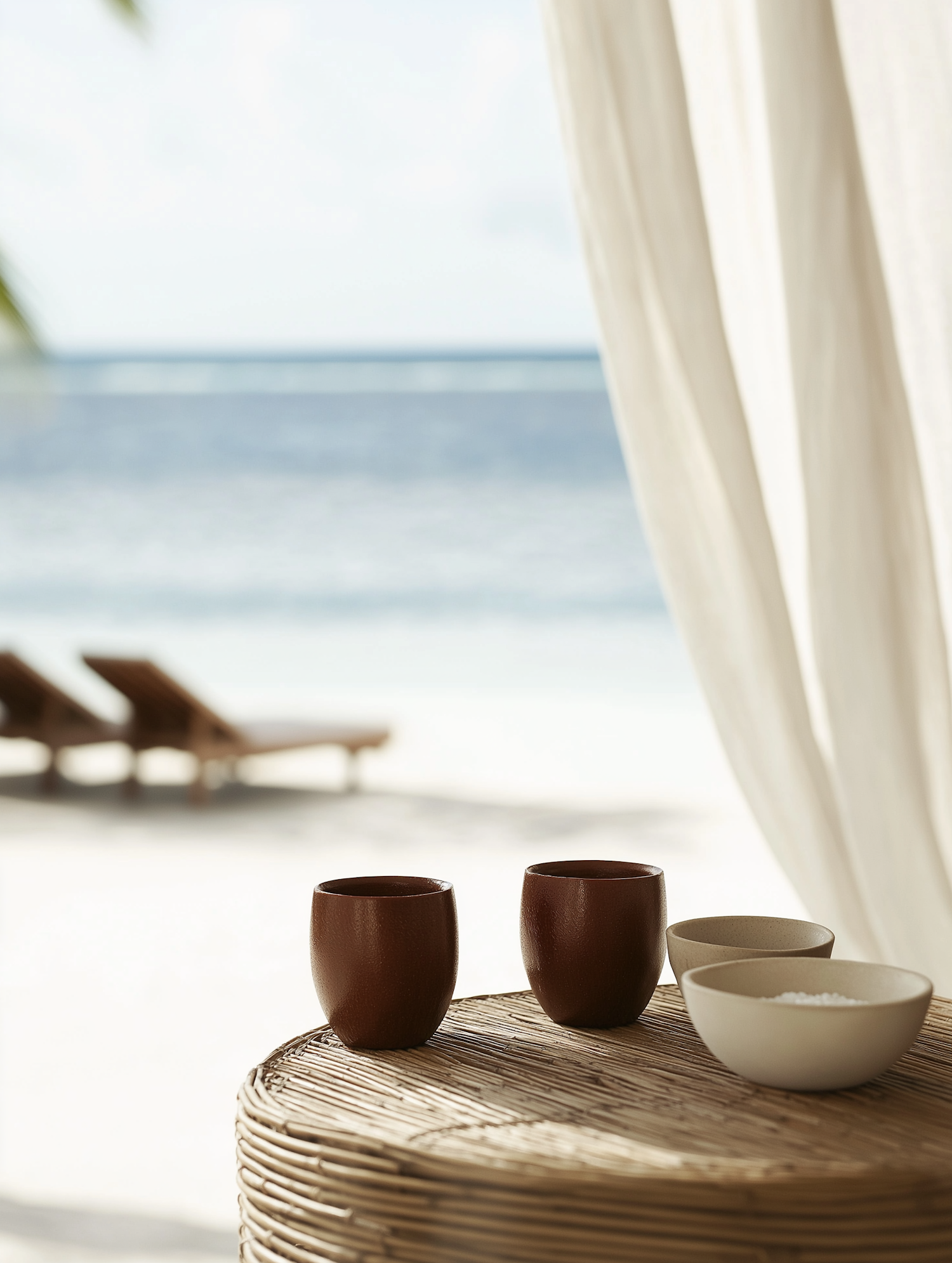 Beachside wicker table with ceramic cups and bowls, flowing curtain, and ocean view in the background. Perfect for a serene getaway.