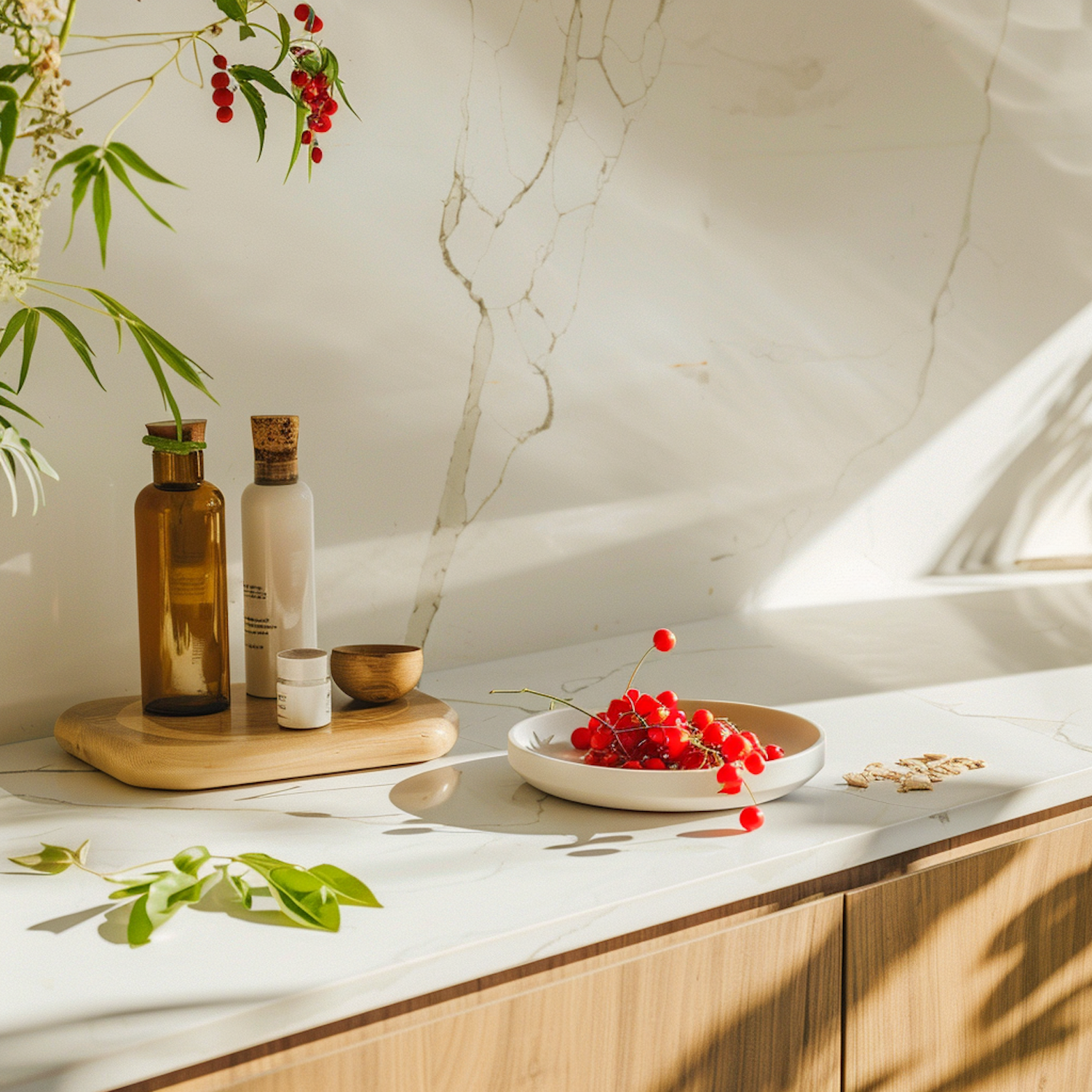Sunlit kitchen counter with bottles, red berries, and green leaves on a marble surface, creating a natural, minimalist vibe.