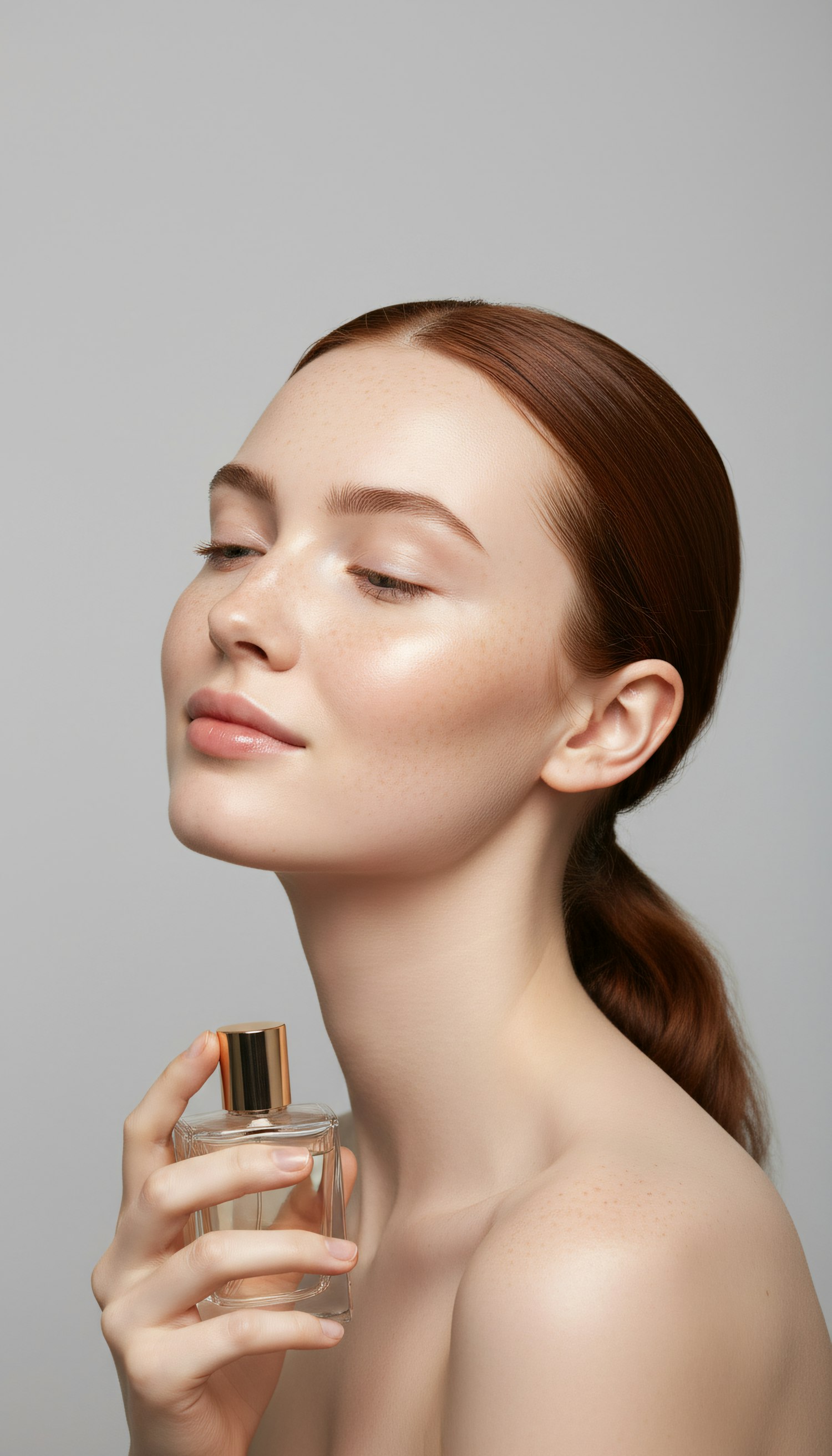 A serene portrait of a woman holding a perfume bottle, showcasing her natural beauty with a soft, neutral background.