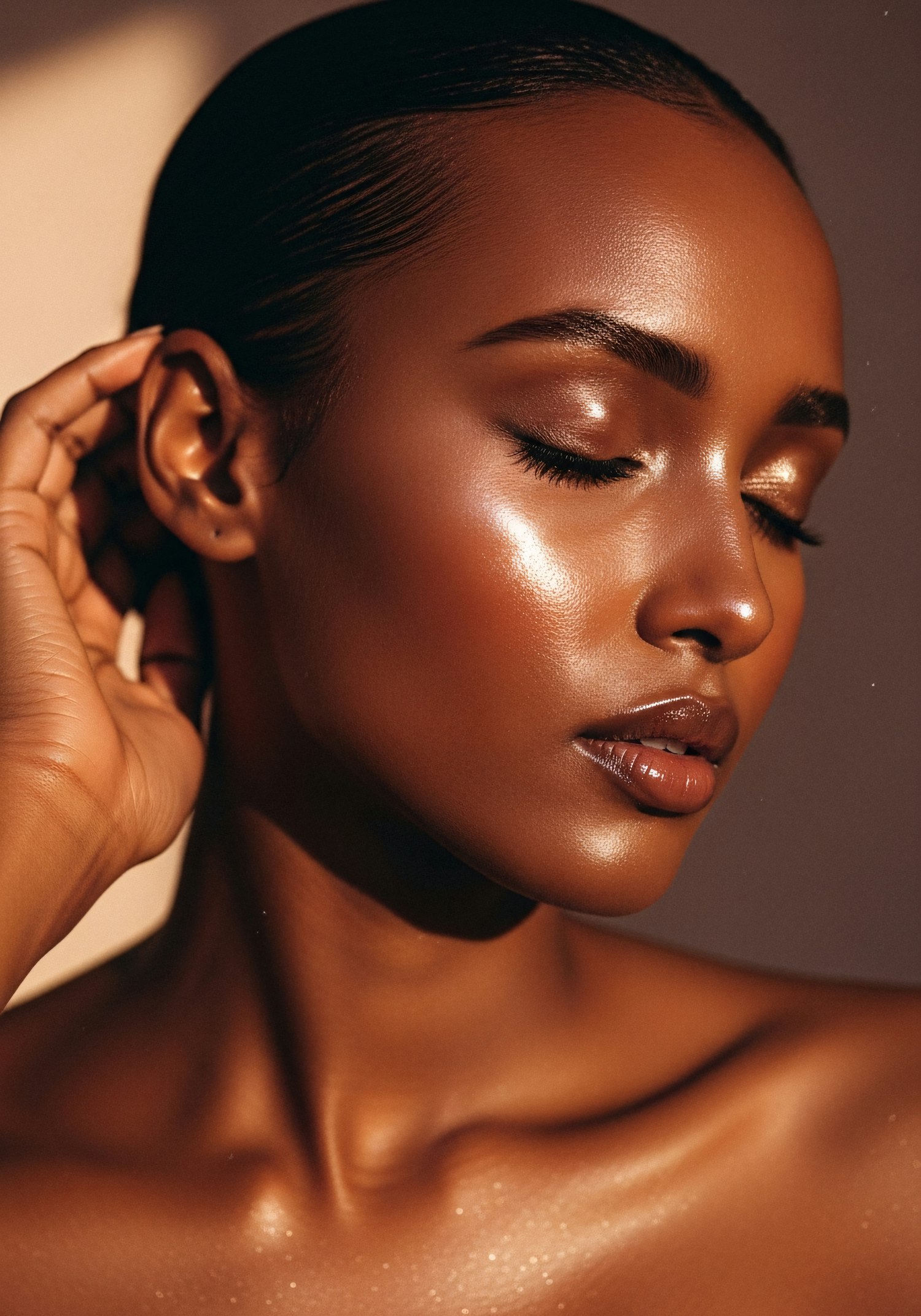 Close-up of a serene woman with glowing skin, closed eyes, and sleek hair, showcasing radiant beauty and soft lighting.