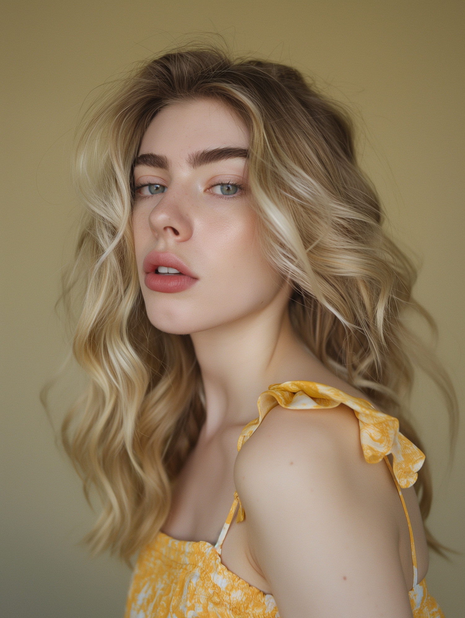 Portrait of a young woman with wavy blonde hair and blue eyes, wearing a yellow dress against a beige background.