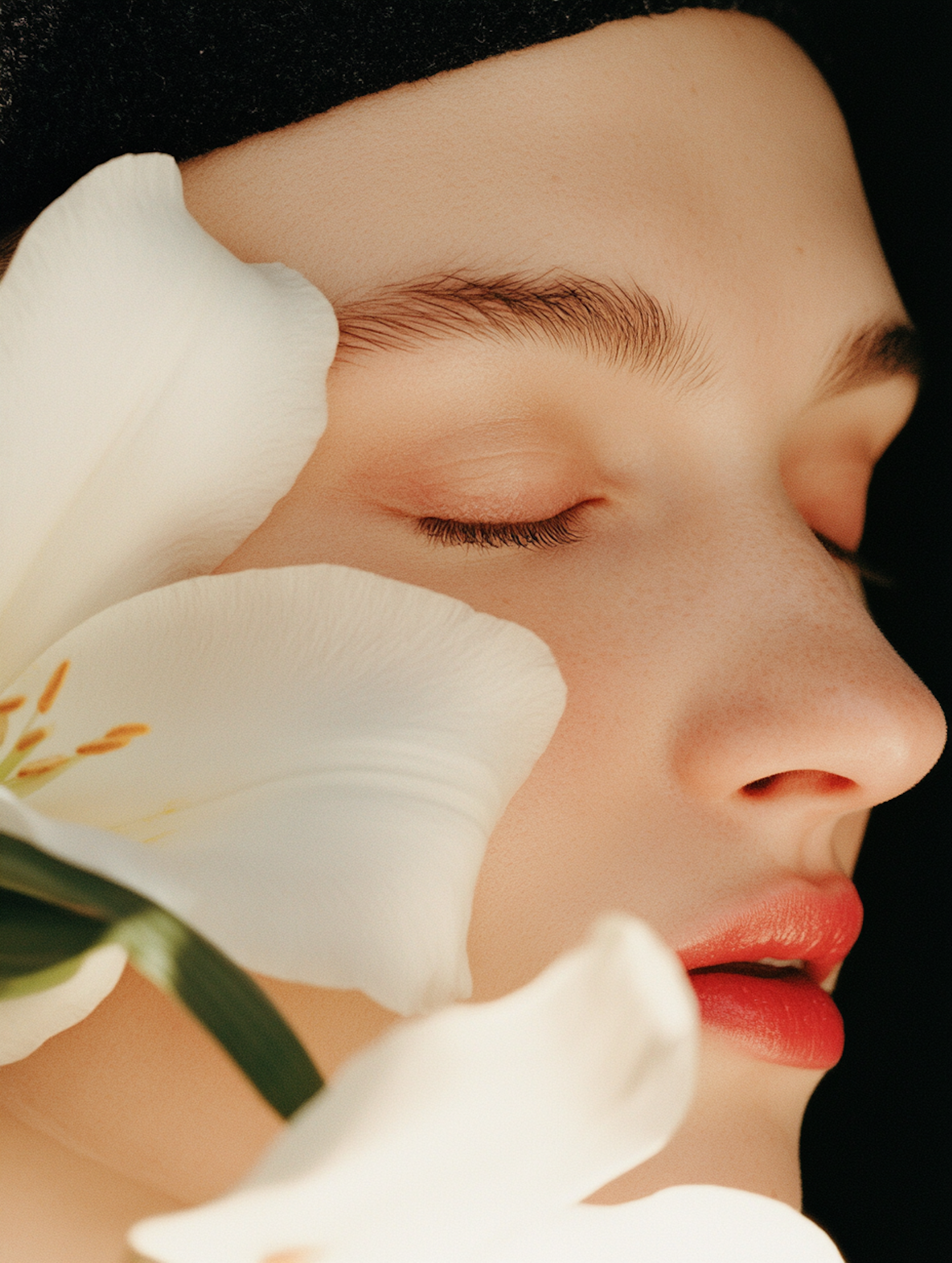 Close-up of a serene face with soft red lips and a white lily, set against a dark background for a striking contrast.