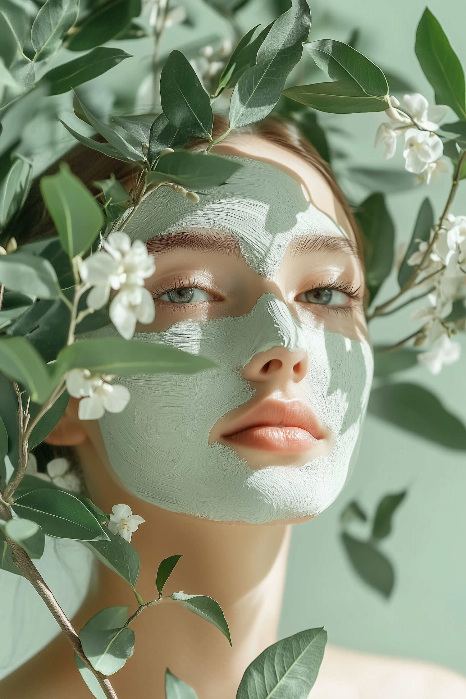 A serene woman with a green facial mask surrounded by lush leaves and white flowers, exuding natural beauty and tranquility.