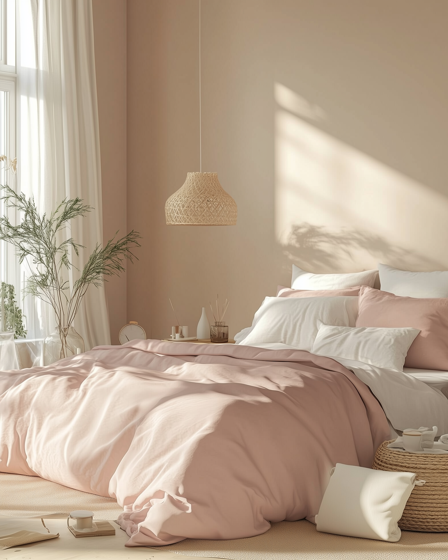 Cozy bedroom with blush pink bedding, beige walls, and boho accents like a rattan pendant light and greenery. Soft natural light fills the space.