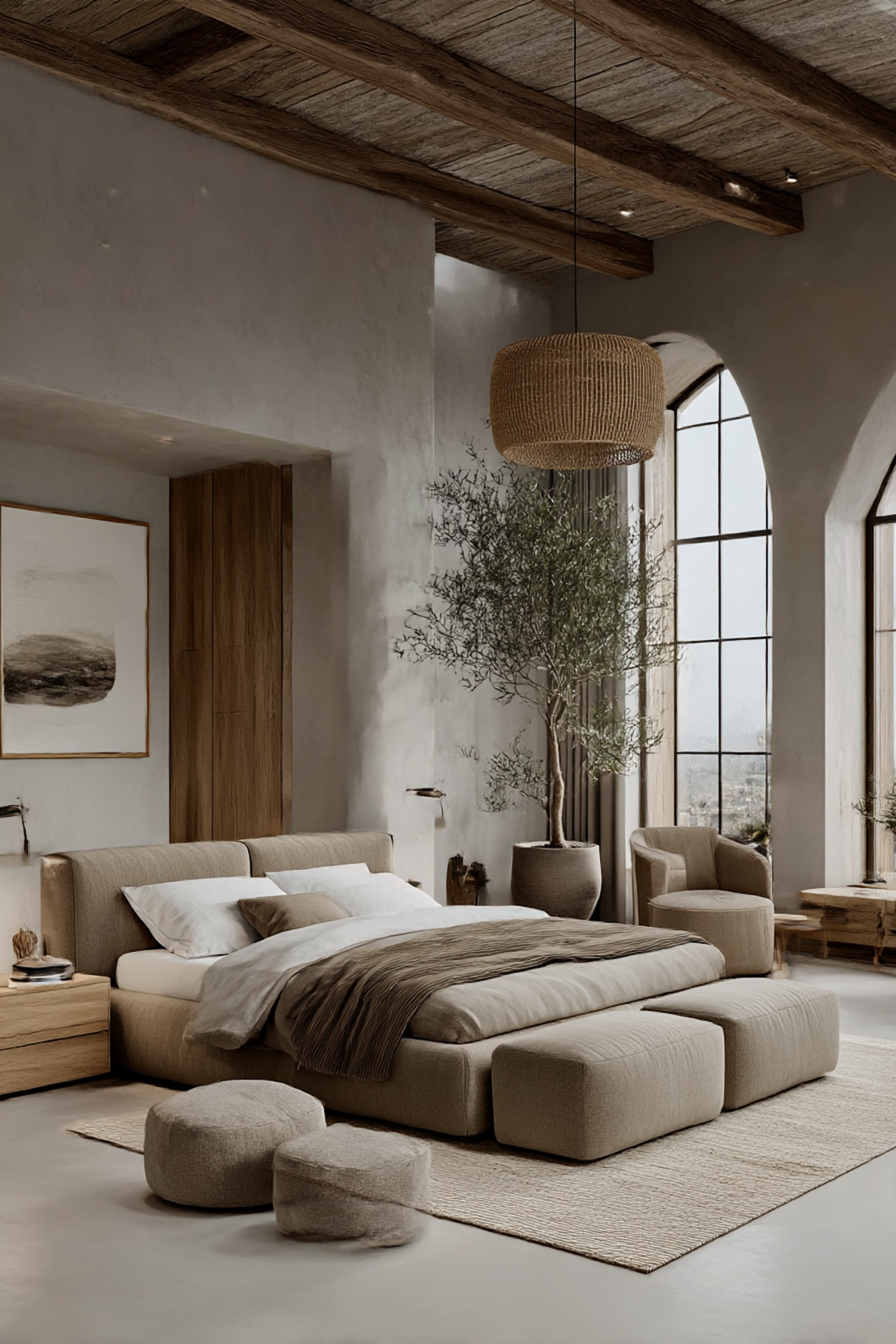 A cozy bedroom with neutral tones, a large bed, natural light, and rustic decor elements like a woven pendant light and wooden beams.