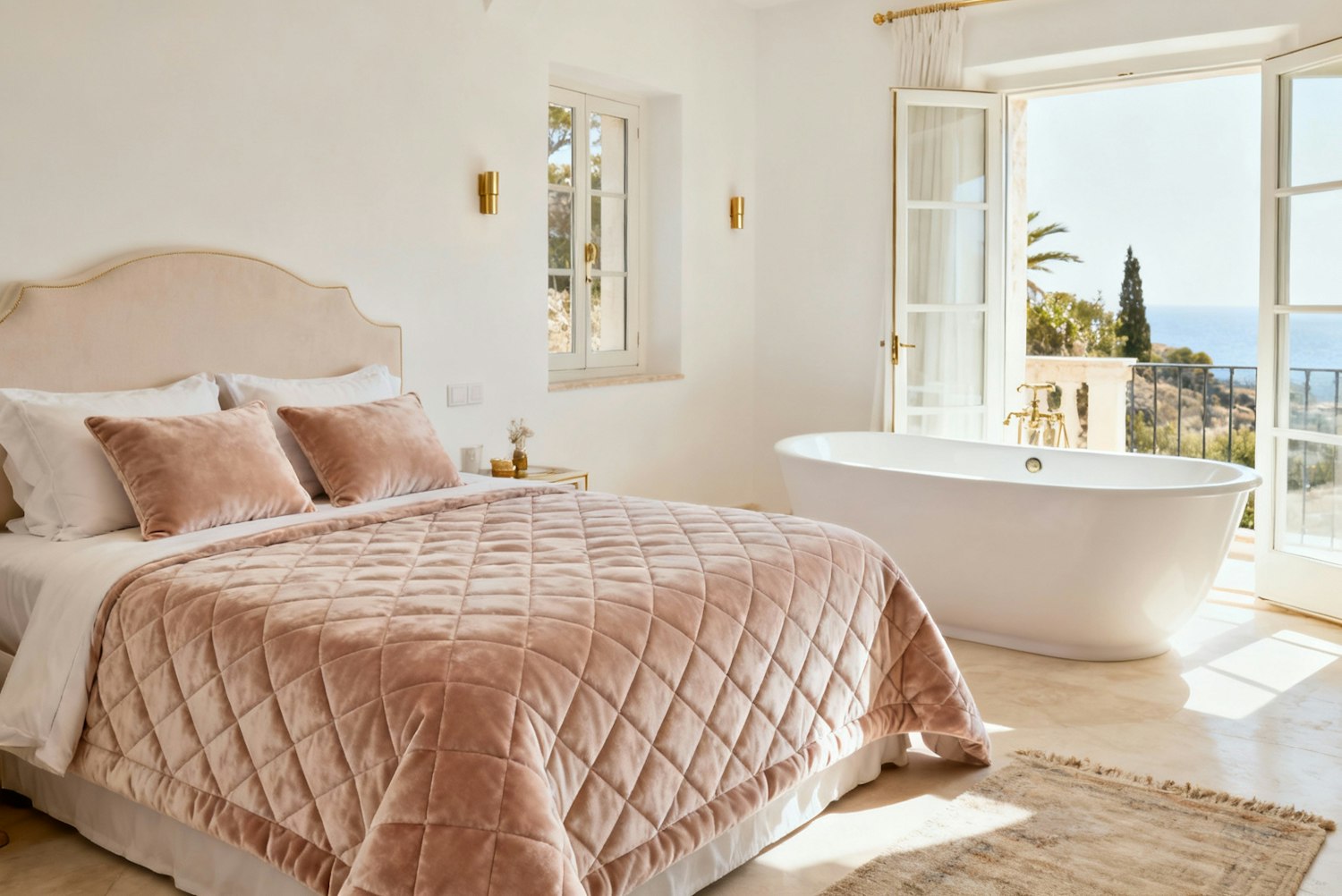 Photographed with soft and warm lighting, cinematic composition, high end editorial style, no people — A serene, spacious bedroom space in a luxury Mediterranean style villa in Southern Spain. The space features a California King bed made with a velvet quilt with a gentle quilted grid effect, in a pale champagne velvet shade. The quilt is matt textured and lightweight - perfect for warm weather. The plush pillows and bedding are arranged neatly, suggesting a high-end, hotel feel. There is a calming outside view and a large white freestanding bathtub. The walls of the space are painted a soft white colour. The overall colour scheme is soft neutral shades with subtle accent shades of gold for a luxe feel. On the floor is a subtle rug, which adds comfort to the space. Decorative items are incorporated sparingly, which maintains a clutter-free and refined ambience. The overall mood is elegant and tranquil with a clean girl aesthetic