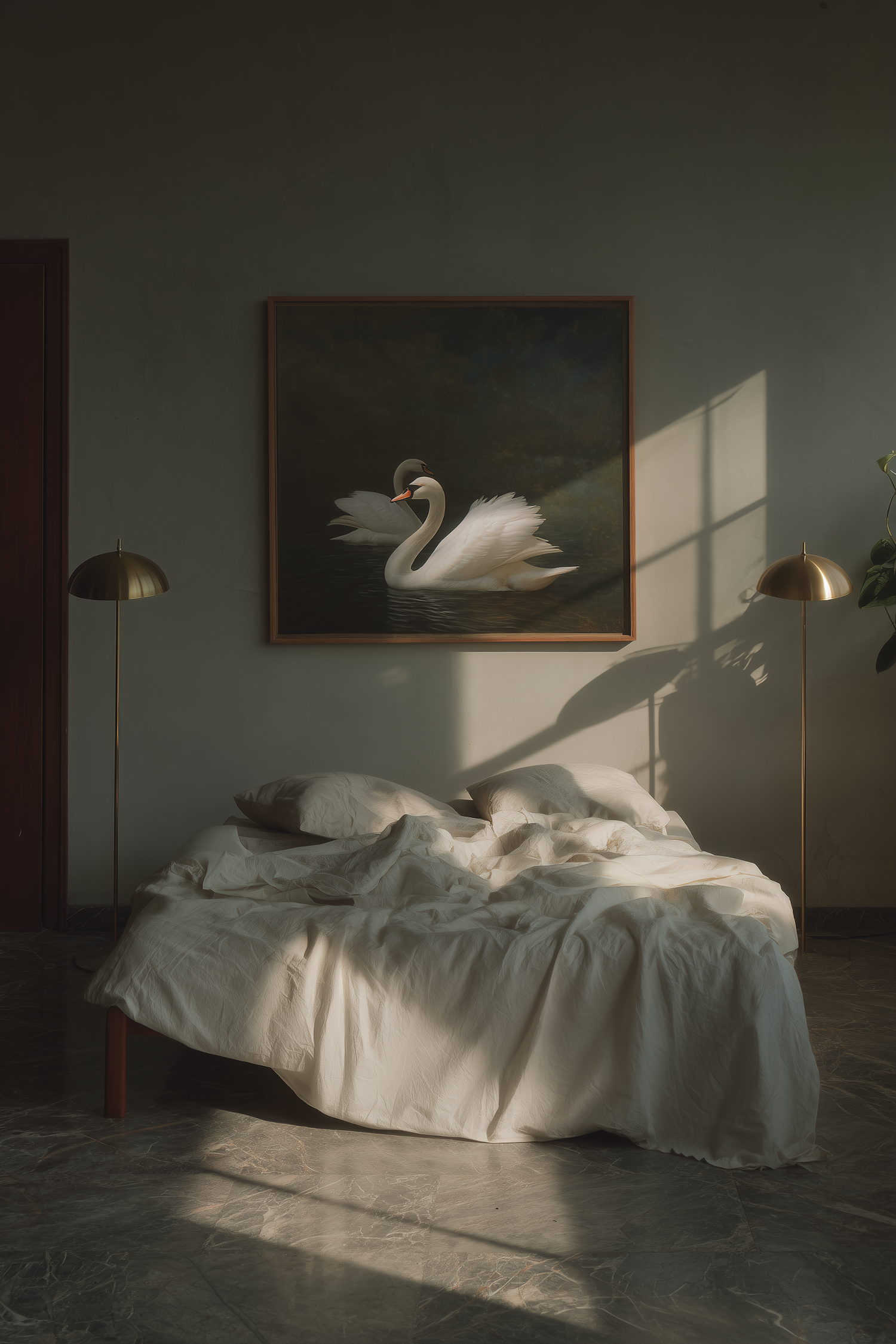 A cozy bedroom with soft lighting, a swan painting above the bed, and elegant golden lamps creating a tranquil and stylish ambiance.