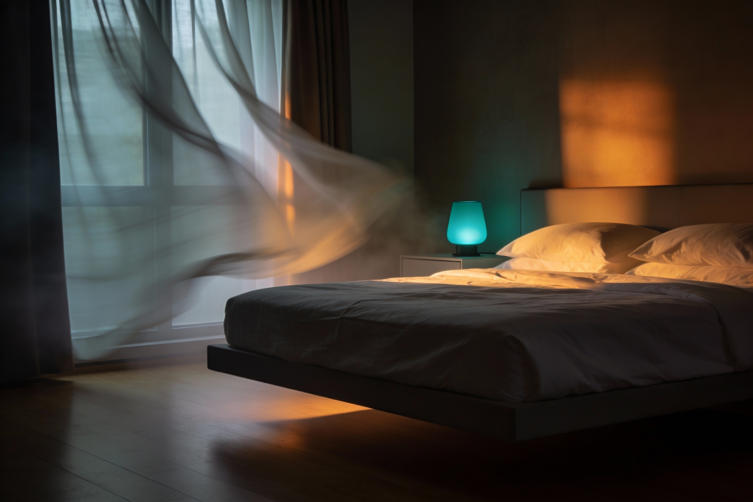 A bedroom where the bed appears to float slightly above the floor, curtains moving in slow motion, teal night light and soft amber highlights, dreamy blur, cinematic intimacy. warm low contrast cinematic