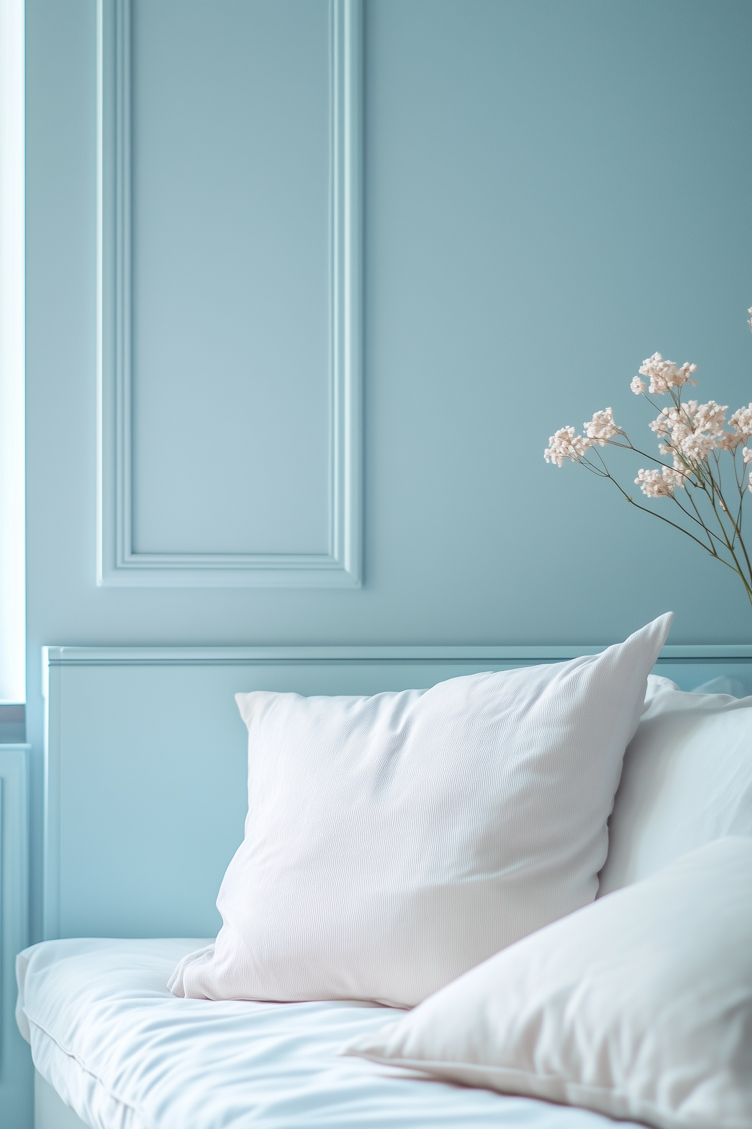 Minimalist bedroom with pastel blue walls, white pillows, and dried flowers in a vase. Soft lighting creates a calm and cozy vibe.