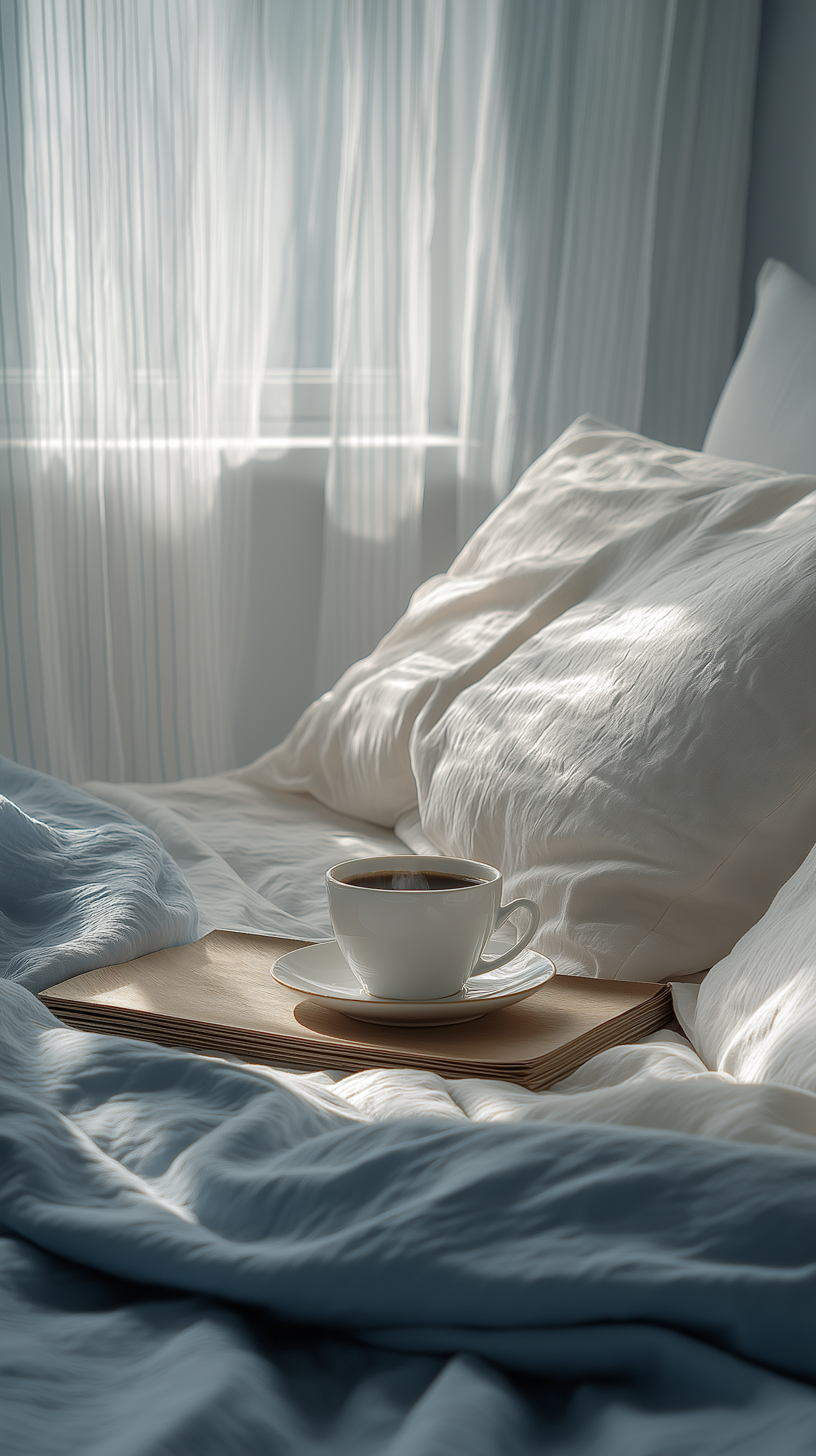Cozy morning vibes with a cup of coffee on a book, soft bedding, and sunlight streaming through sheer curtains.