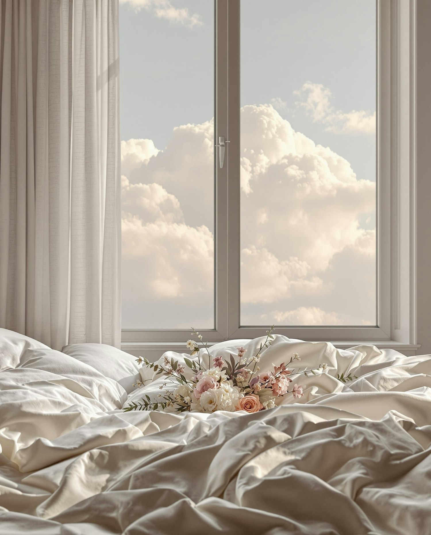 A cozy bed with white sheets and a pastel flower bouquet, set against a window view of a bright sky with fluffy clouds.