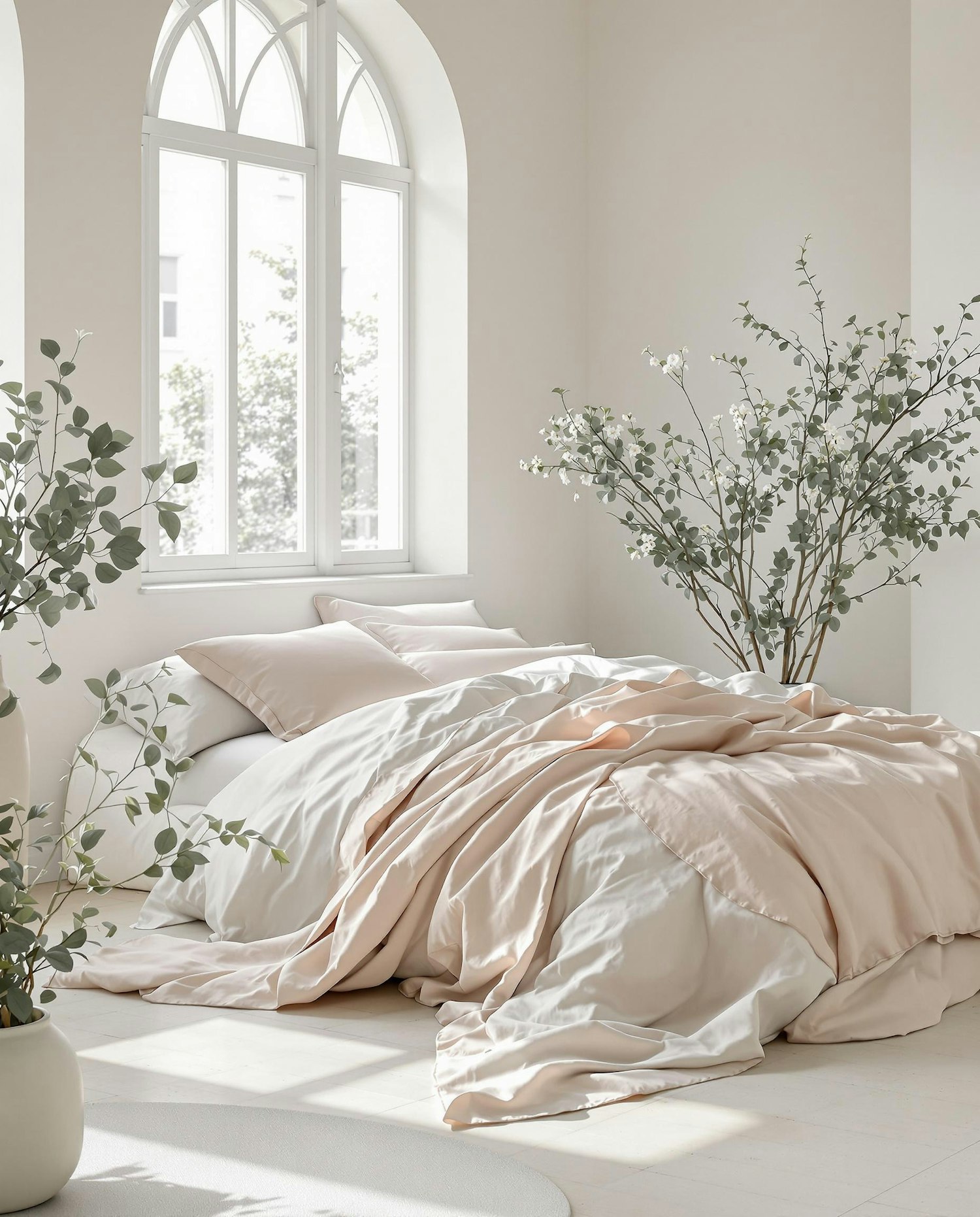 Bright, minimalist bedroom with soft pastel bedding, arched window, and lush greenery for a serene and cozy vibe.