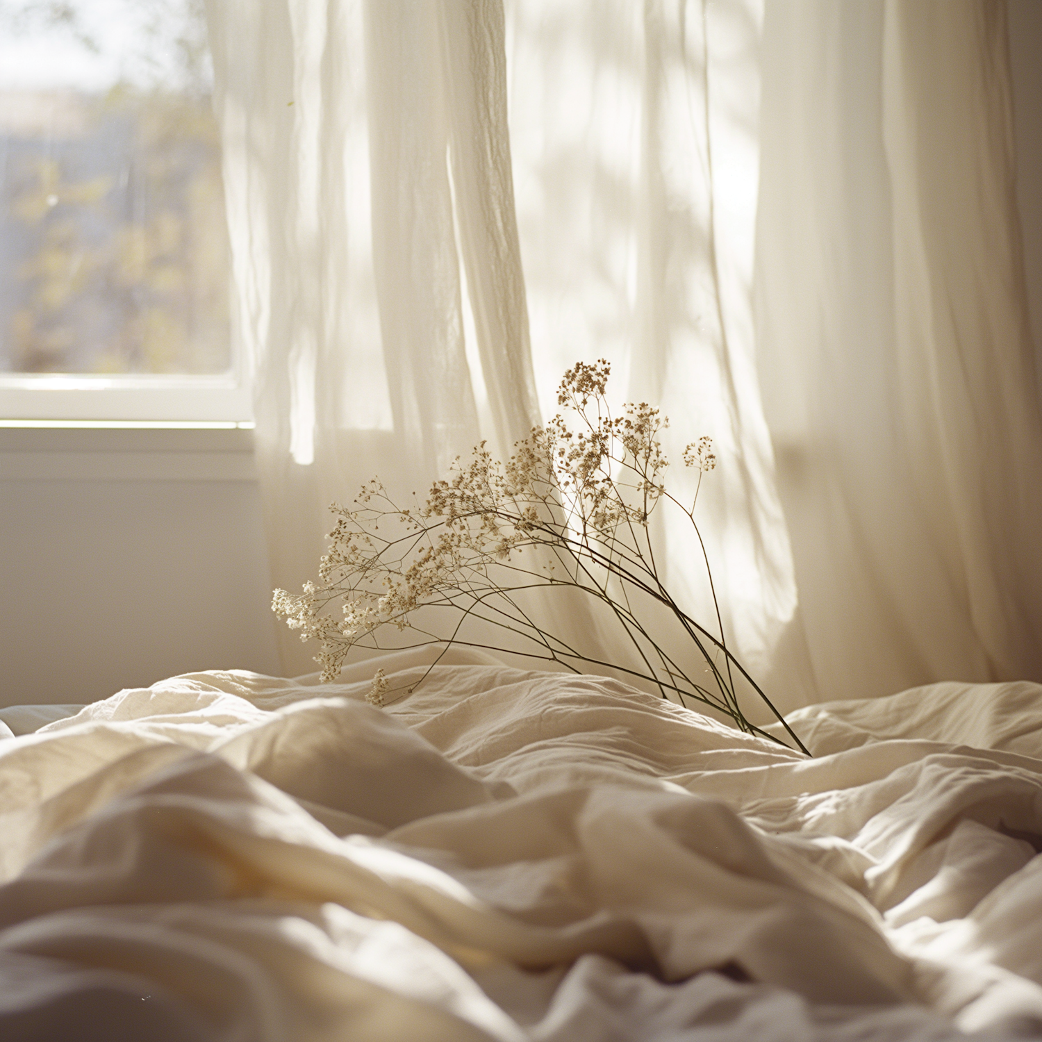 Soft sunlight filters through sheer curtains onto a cozy bed with cream bedding and a sprig of baby's breath, creating a tranquil, minimalist vibe.