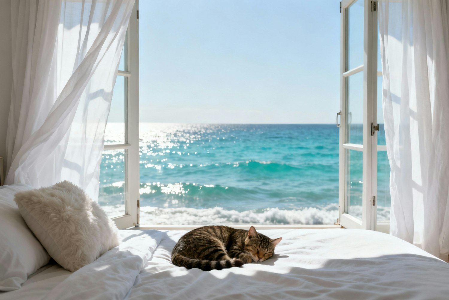 A cozy bedroom with a napping tabby cat, open windows revealing a sparkling ocean view, and soft white curtains swaying in the breeze.