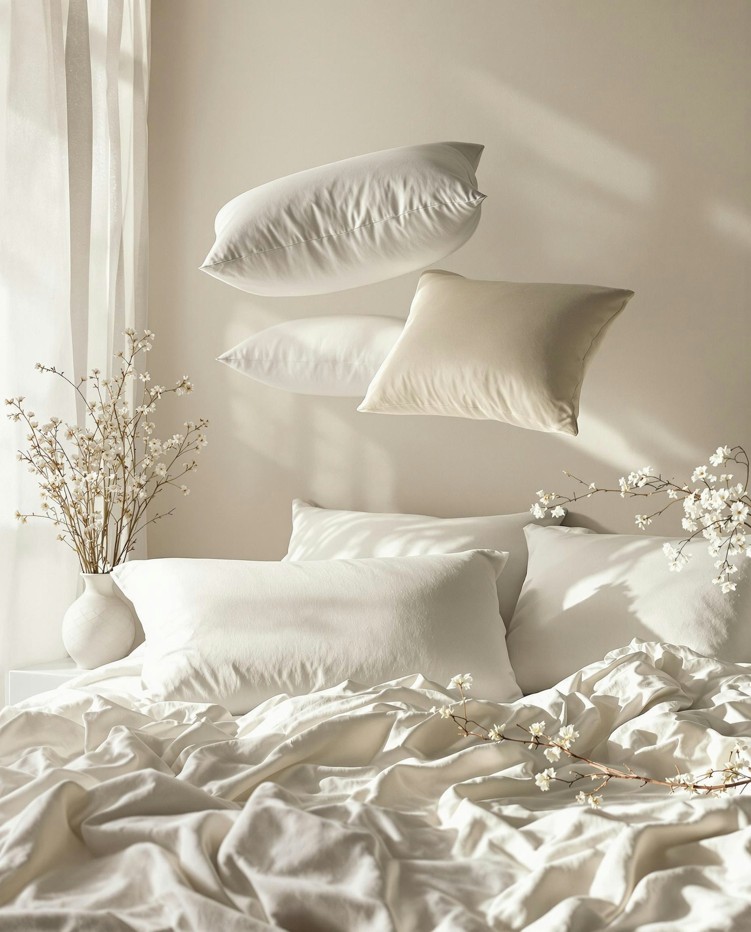 A serene bedroom scene with floating pillows, white bedding, and delicate floral accents in soft natural light.