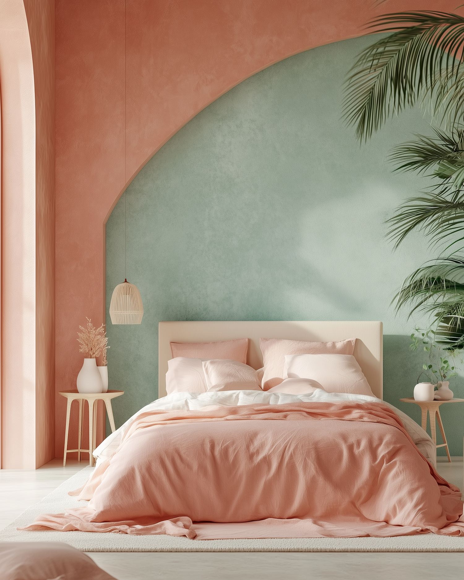 Cozy bedroom with peach bedding, pastel walls, and minimalist decor. Perfect blend of soft tones and natural textures for a serene vibe.