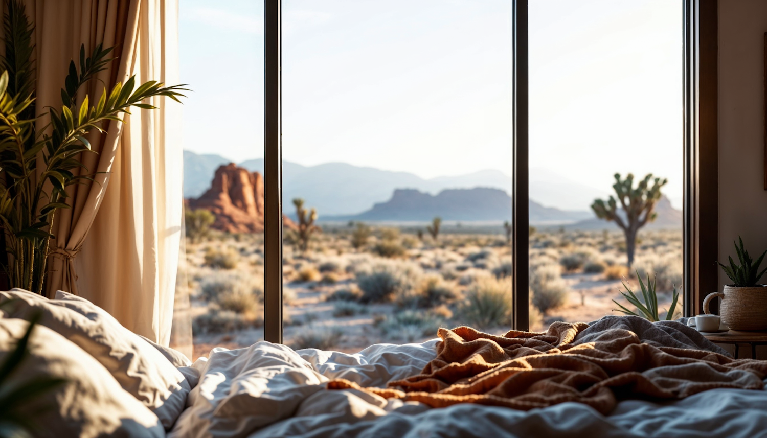 Cozy bedroom with a large window view of a desert landscape, featuring unmade bed, soft sunlight, and serene natural beauty.