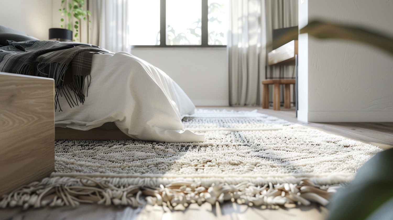 Cozy bedroom with natural light, wooden bed, plaid throw, textured rug, and potted plant. Minimalist and serene ambiance.