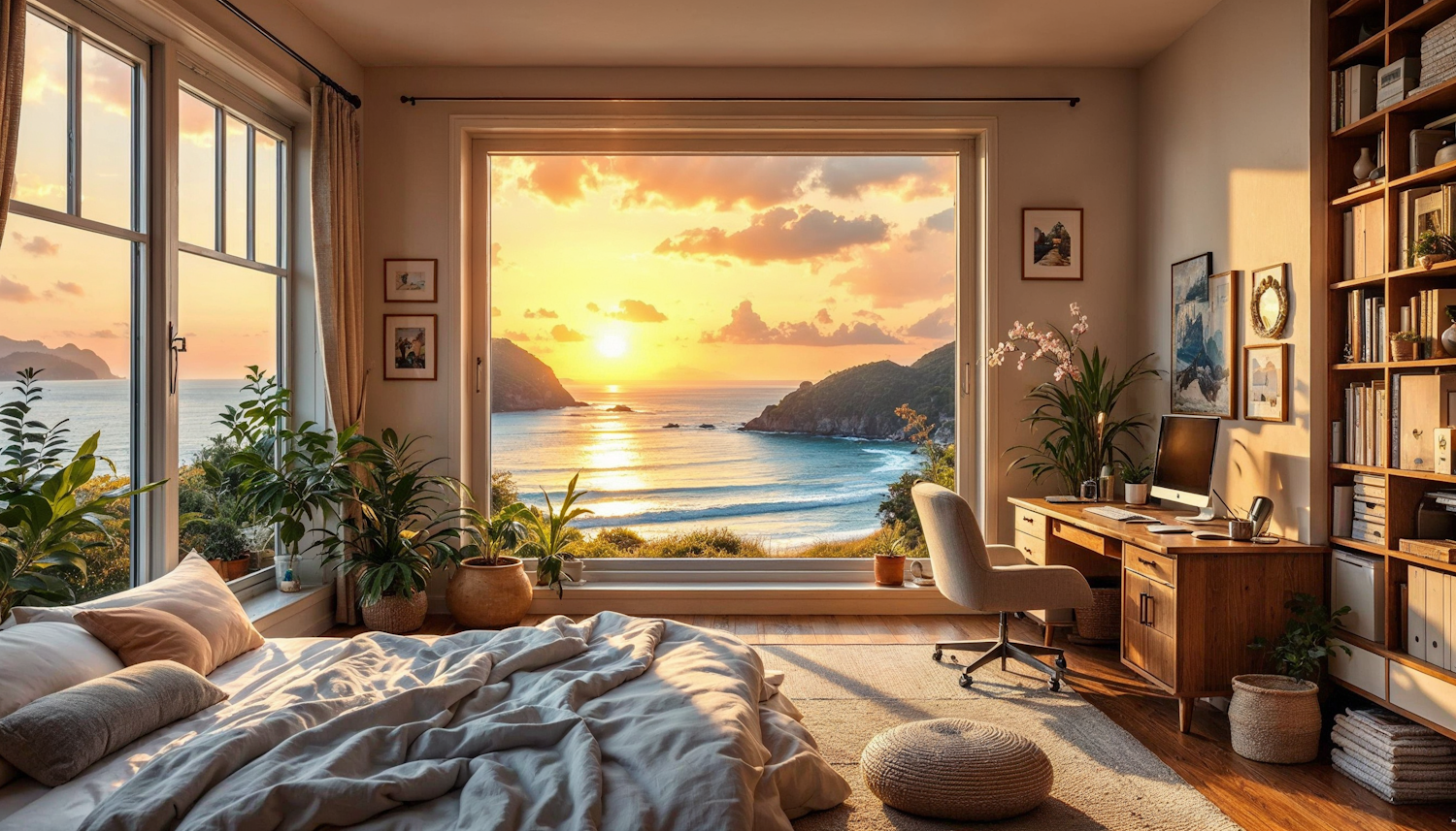Cozy bedroom with ocean view at sunset, featuring a comfy bed, wooden desk, and lush plants. Perfect blend of relaxation and workspace.