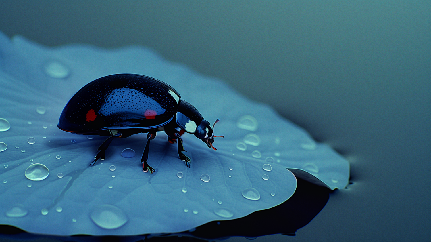 Shiny black beetle with red spots on a dewy leaf, reflecting light in a serene blue-toned setting.