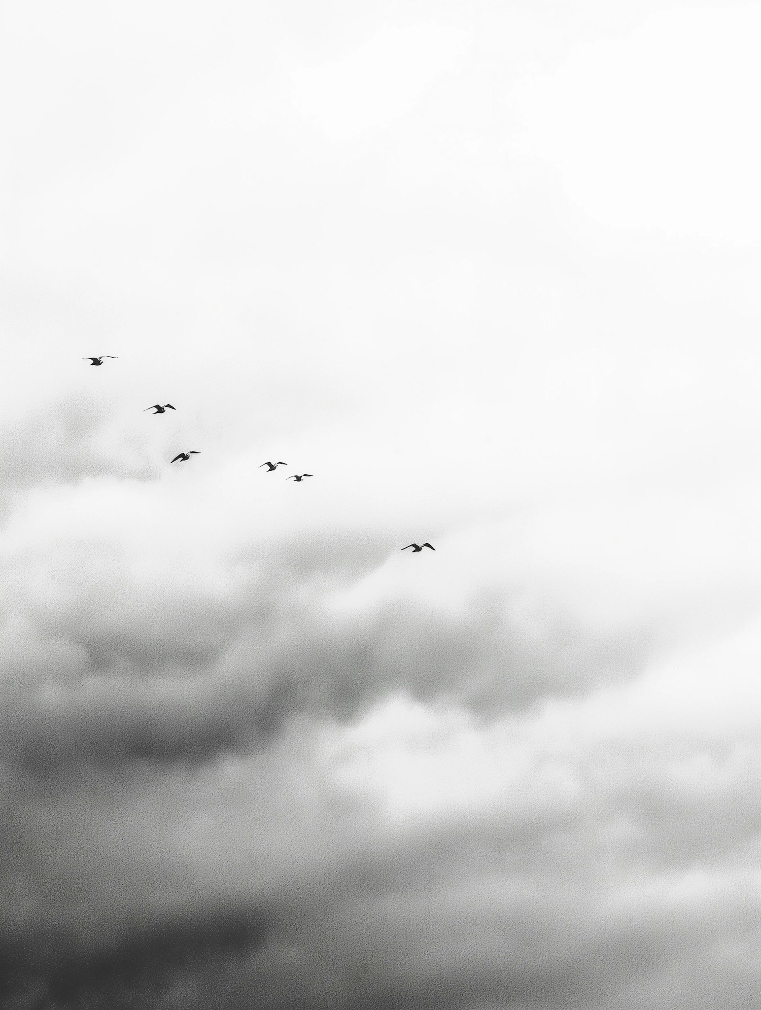 Minimalist photo of six birds flying across a dramatic, cloudy sky with textured gray clouds and a serene, melancholic atmosphere.