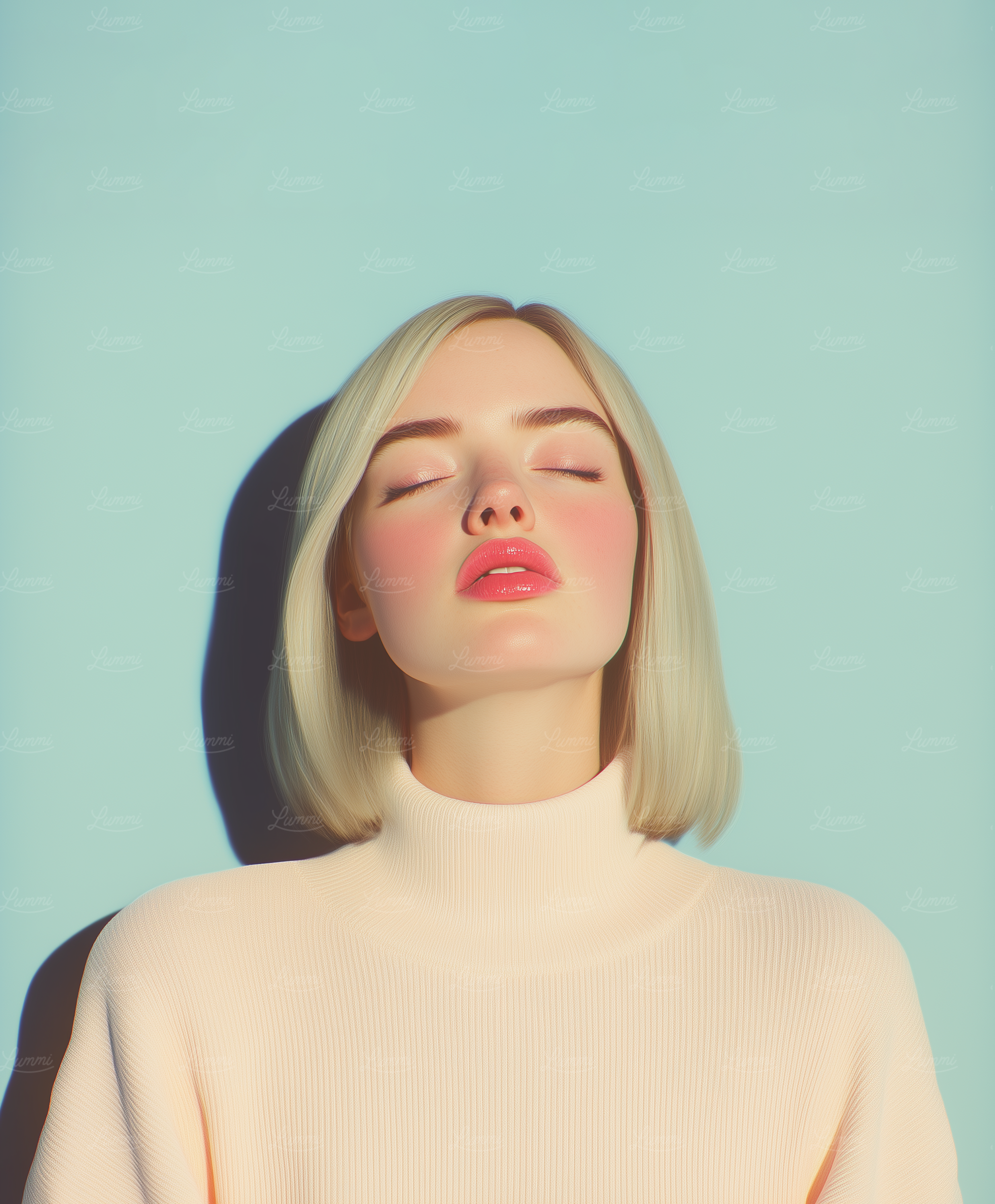 A serene portrait of a blonde woman in a cream turtleneck against a pastel blue background, with soft lighting and a minimalist vibe.
