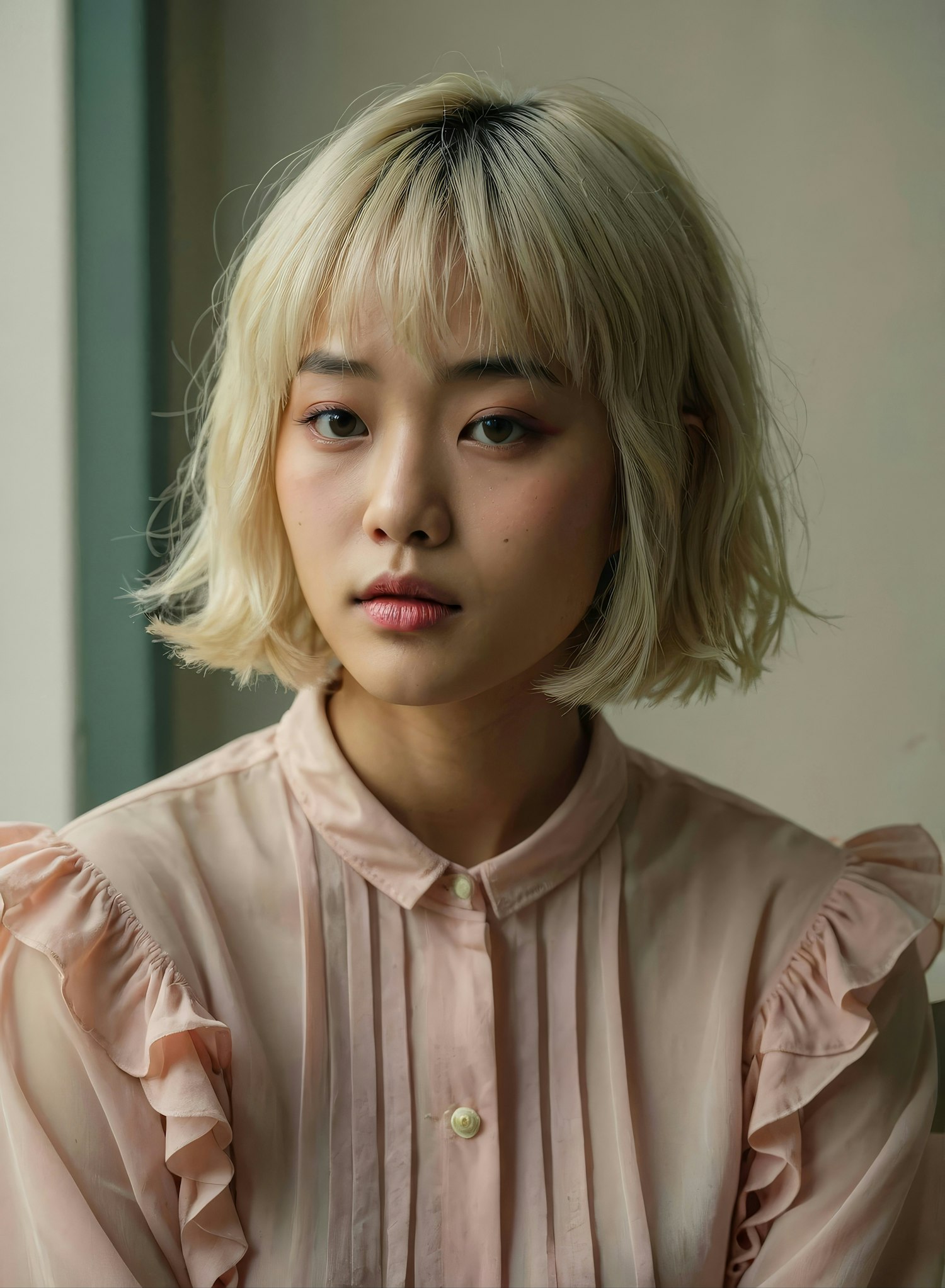 A serene portrait of a young woman with platinum blonde hair, wearing a pink ruffled blouse, captured in soft natural light.