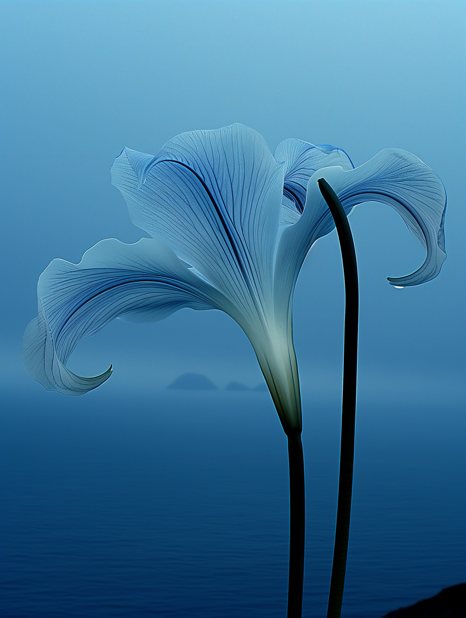 Delicate translucent flowers with intricate veins against a serene blue backdrop, featuring misty islands in the distance.