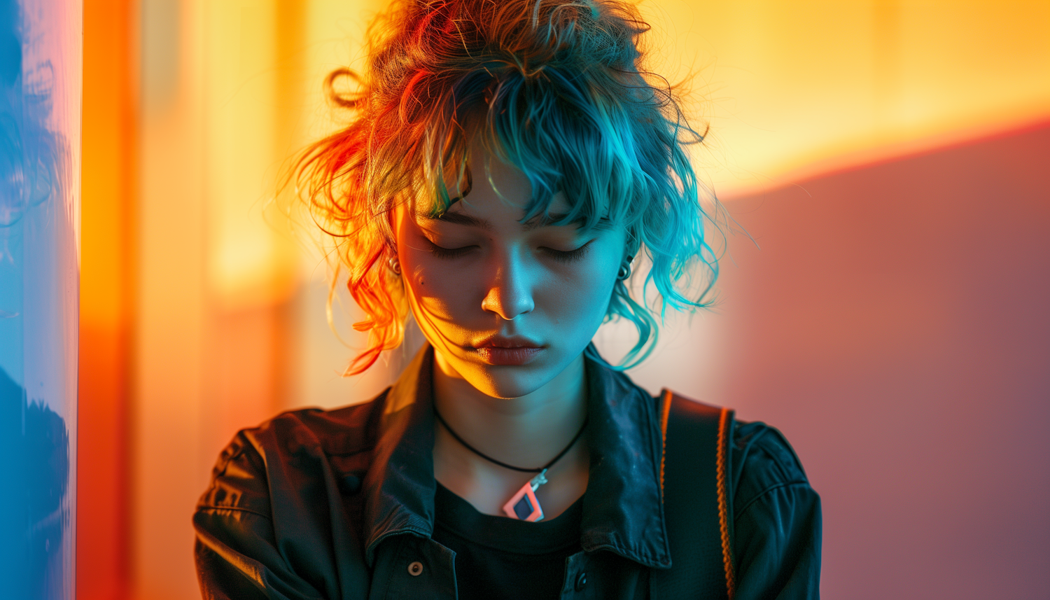 A young woman with vibrant blue and red hair stands with eyes closed, bathed in warm, colorful light. Her expression is contemplative.