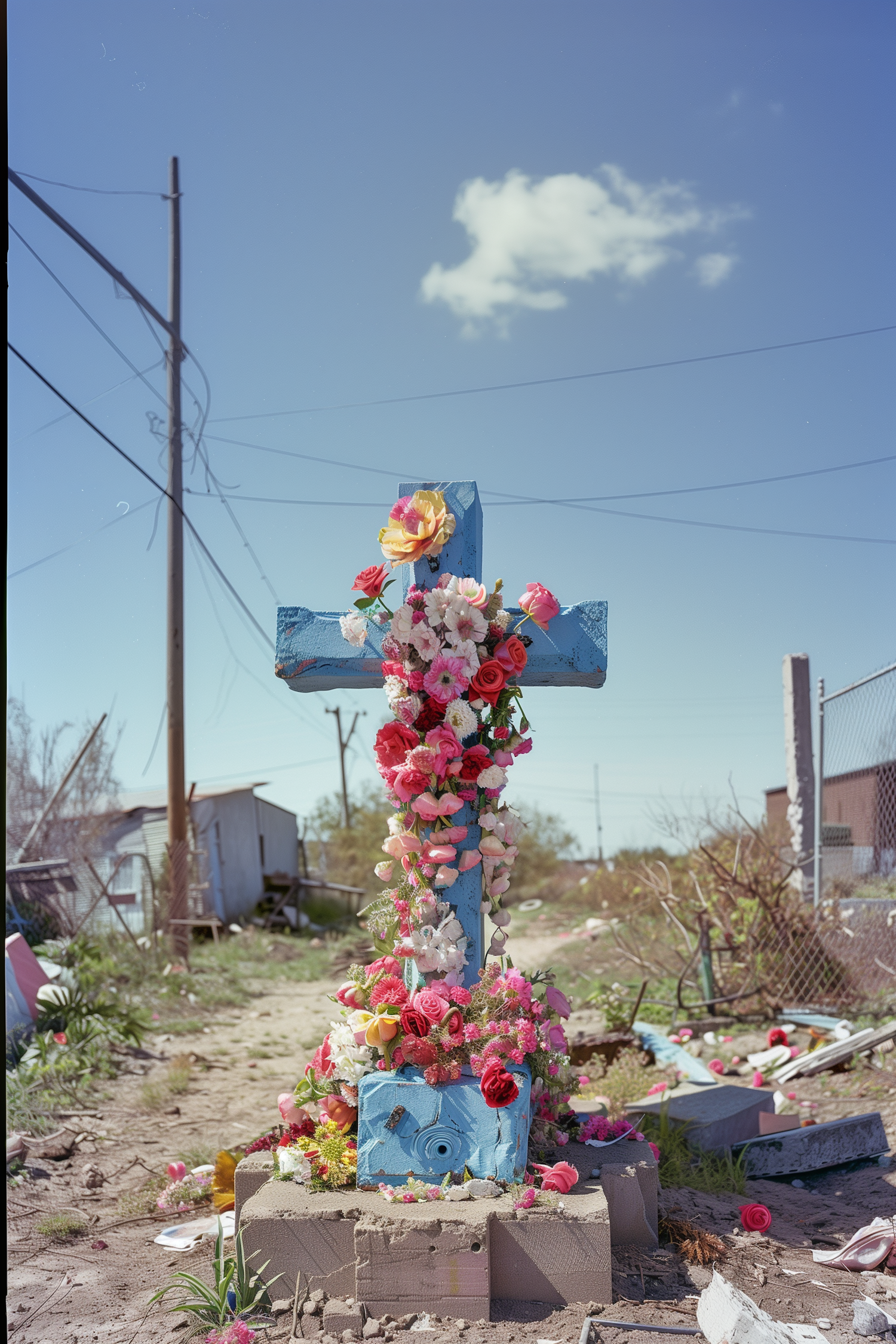 A blue wooden cross with colorful flowers in a desolate area, under a clear sky with a single cloud.