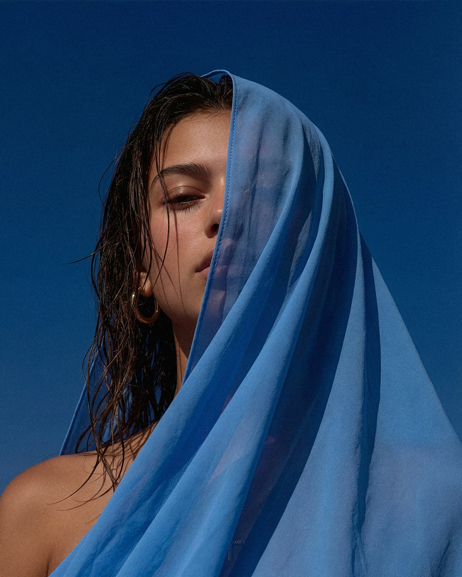A serene portrait of a woman with wet hair, partially veiled by blue fabric, set against a vibrant blue sky.