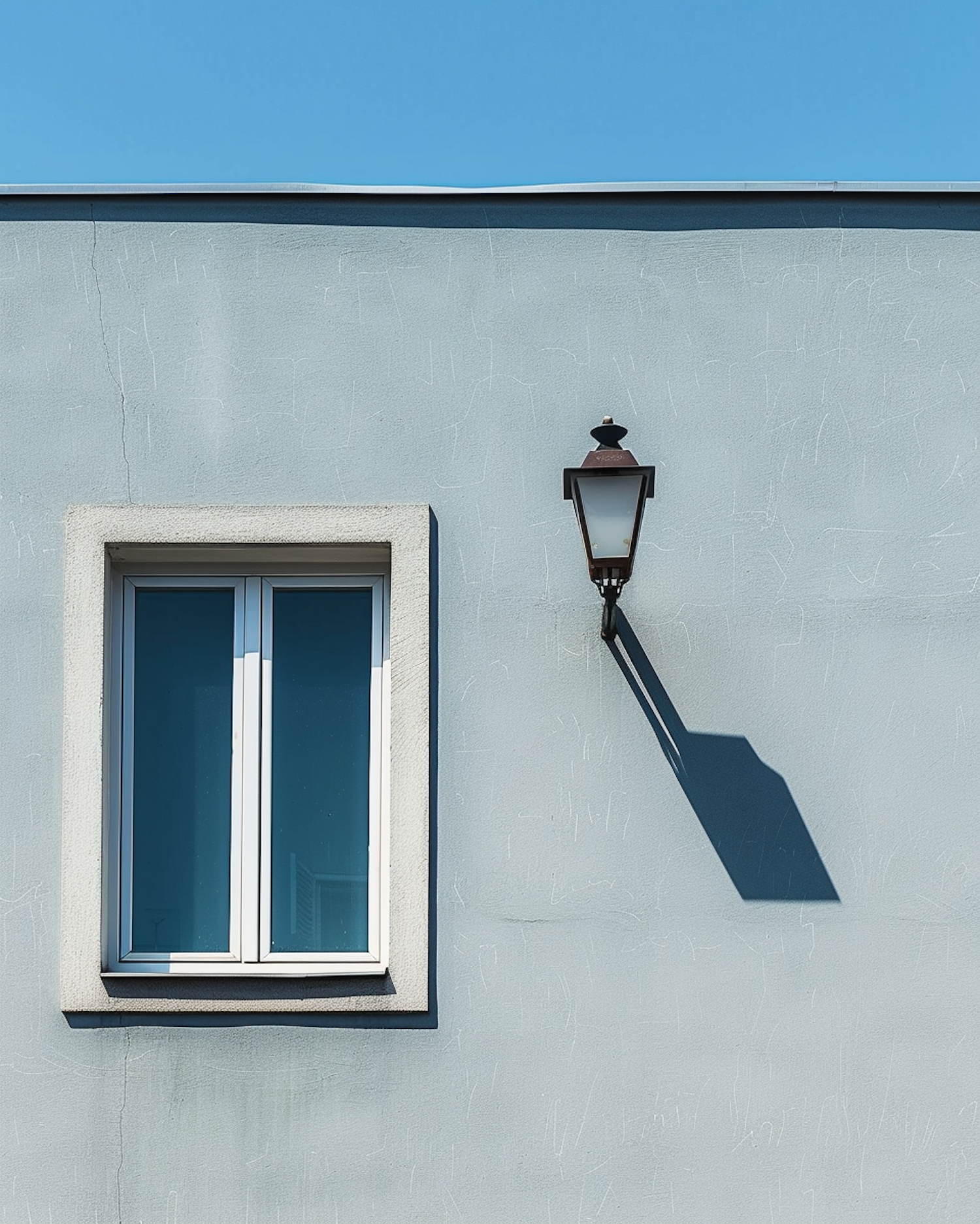 Minimalist light blue wall with a window and black lantern casting a shadow. Simple, clean lines and contrasting elements.