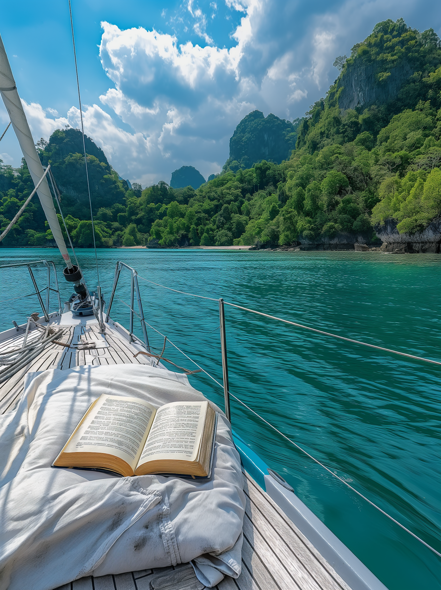 Sailboat with an open book on deck, cruising towards a lush island under a bright blue sky with fluffy clouds.