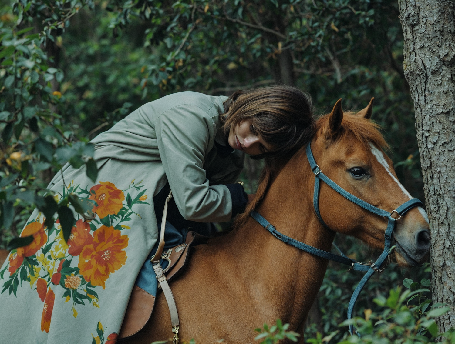 Woman in a floral coat rests on a chestnut horse in a lush forest, creating a serene and intimate moment.