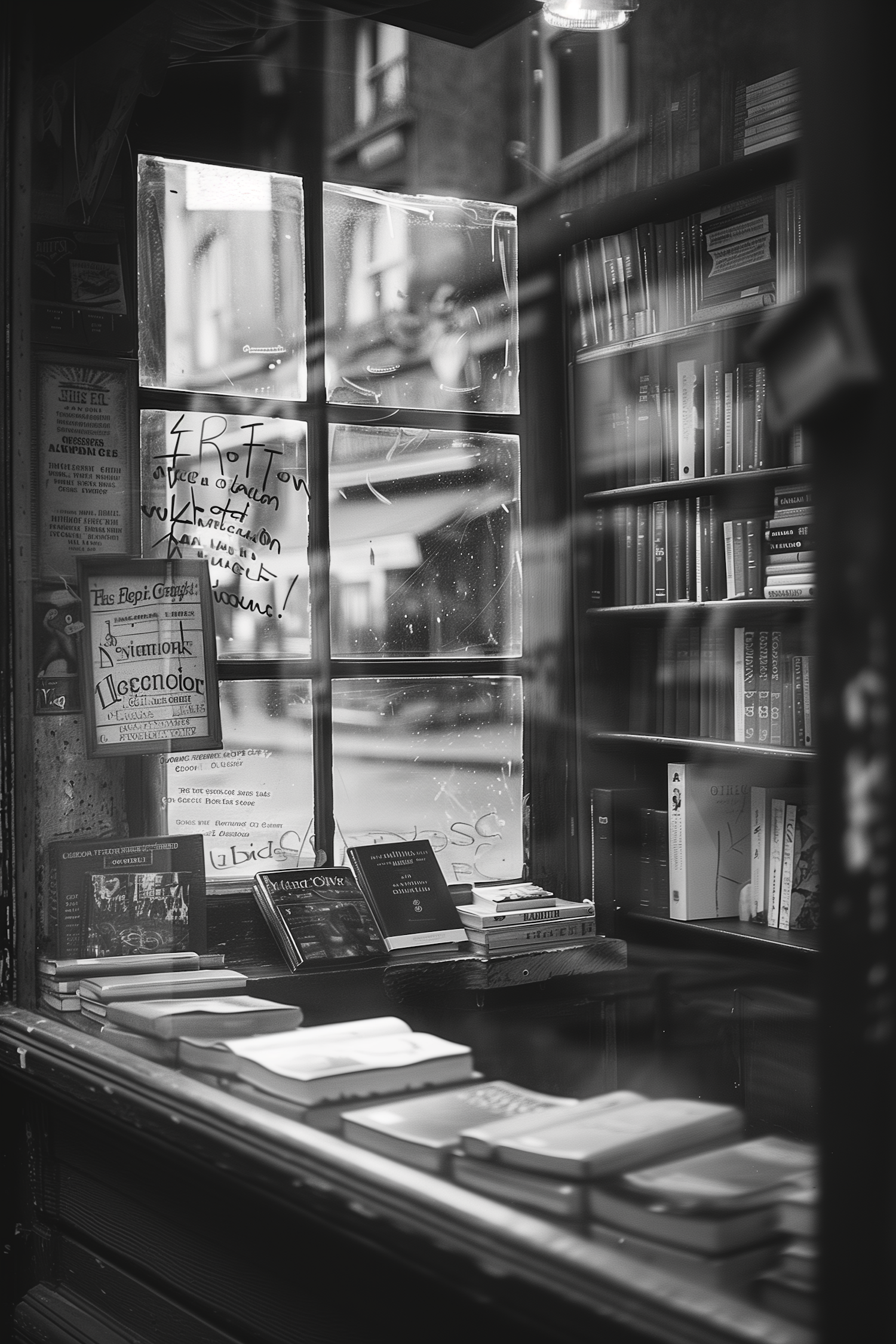 Black and white photo of a cozy bookstore with books on shelves and a table, reflecting a street view through the window.