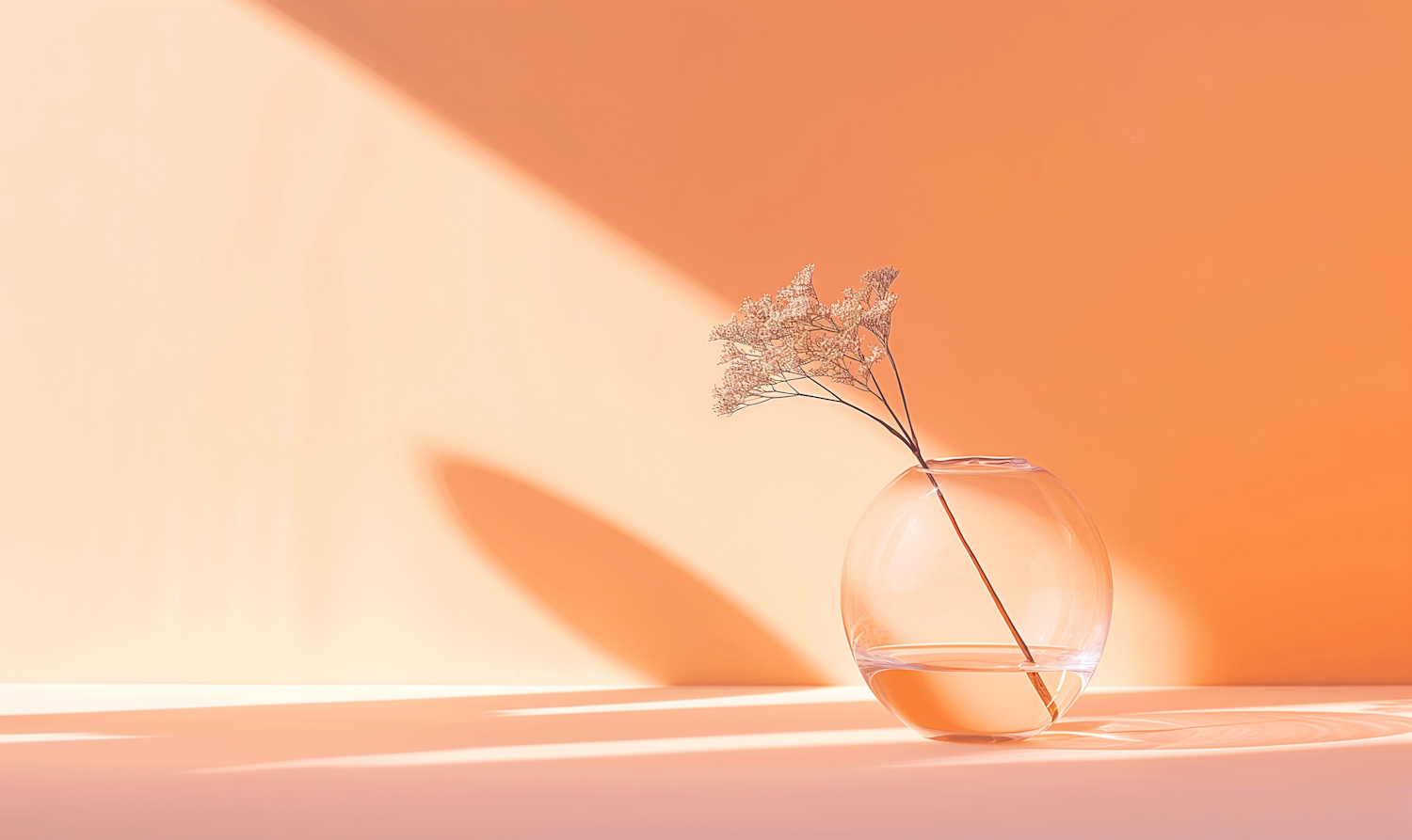 Minimalist glass vase with dried flower on a peach-orange background, featuring soft light and shadows for a serene aesthetic.