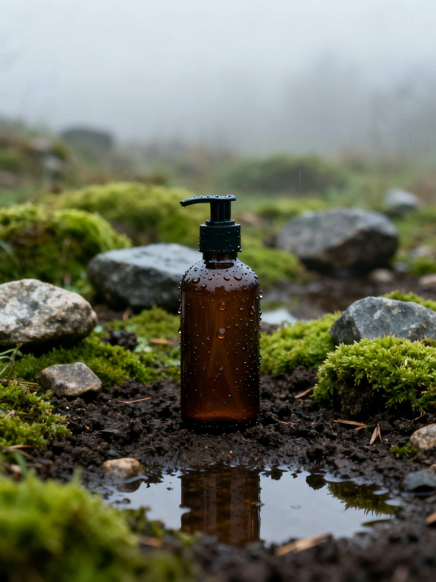 A brown glass bottle with a pump dispenser sits on wet soil surrounded by moss and rocks, reflecting in a puddle under a misty sky.