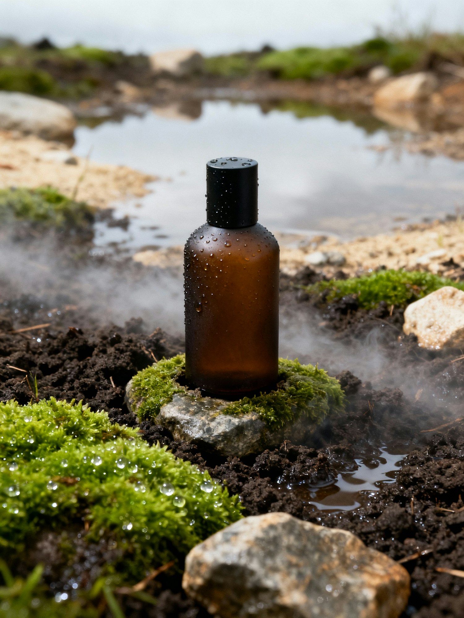 Mat brown skincare product with black cap, no label or text, on a natural flatlay surrounded by moss, stones, and wet soil. Light mist in the air and dew droplets on the surface. Soft overcast daylight, cinematic and tactile mood, earthy palette with tones of green, brown, beige, and grey. The product appears slightly embedded in the ground, with subtle water reflections. Detailed realistic textures — moist moss, rough stone, glossy glass or matte surface. Photography inspired by Aesop outdoor campaigns, shallow depth of field, macro realism. → A mat brown bottle with a black cap stands upright on a stone partially covered in moss. Soft light brushes across the top, highlighting fine water droplets. Around it, the ground is damp, and fog swirls subtly behind. Every surface — from rock to moss — appears textural and alive with moisture.
