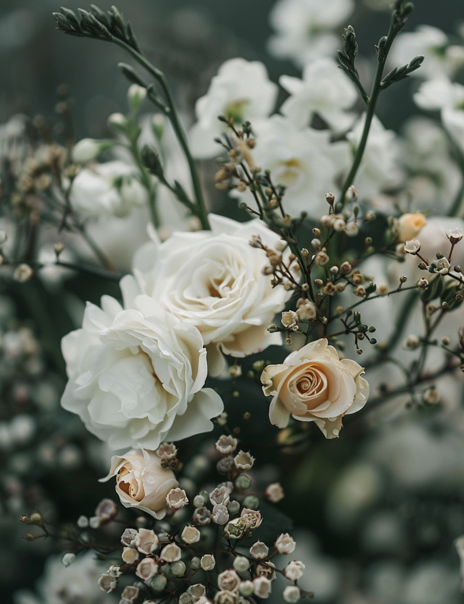 Elegant bouquet of white and cream roses with baby's breath, creating a serene and harmonious floral arrangement.