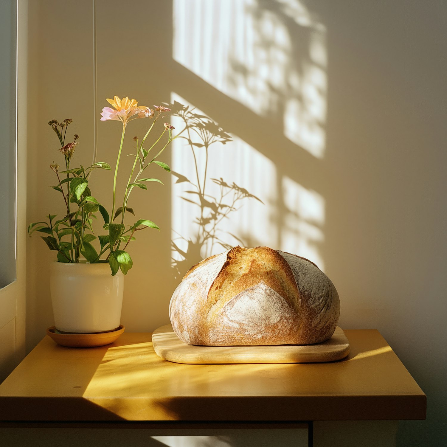 A rustic loaf of bread and a potted plant in warm sunlight, creating a cozy and serene atmosphere with intricate shadows.