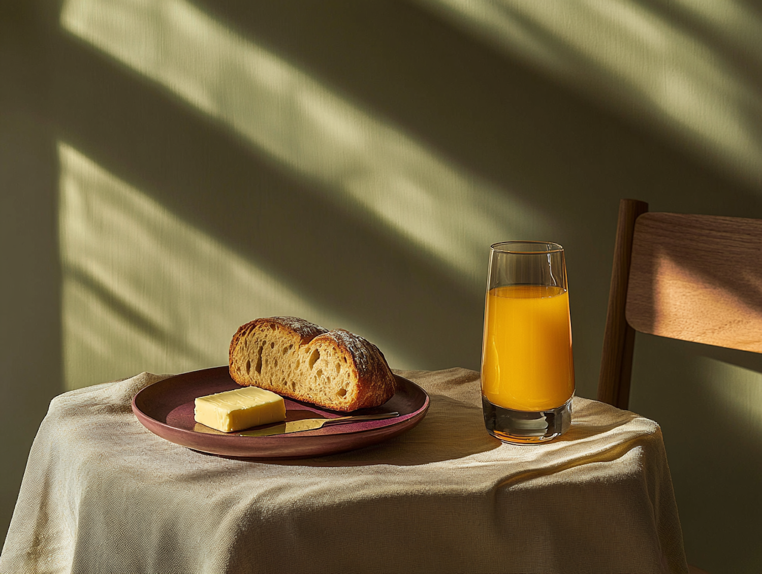 Rustic bread, butter, and orange juice on a beige tablecloth with soft sunlight and shadows creating a cozy breakfast vibe.