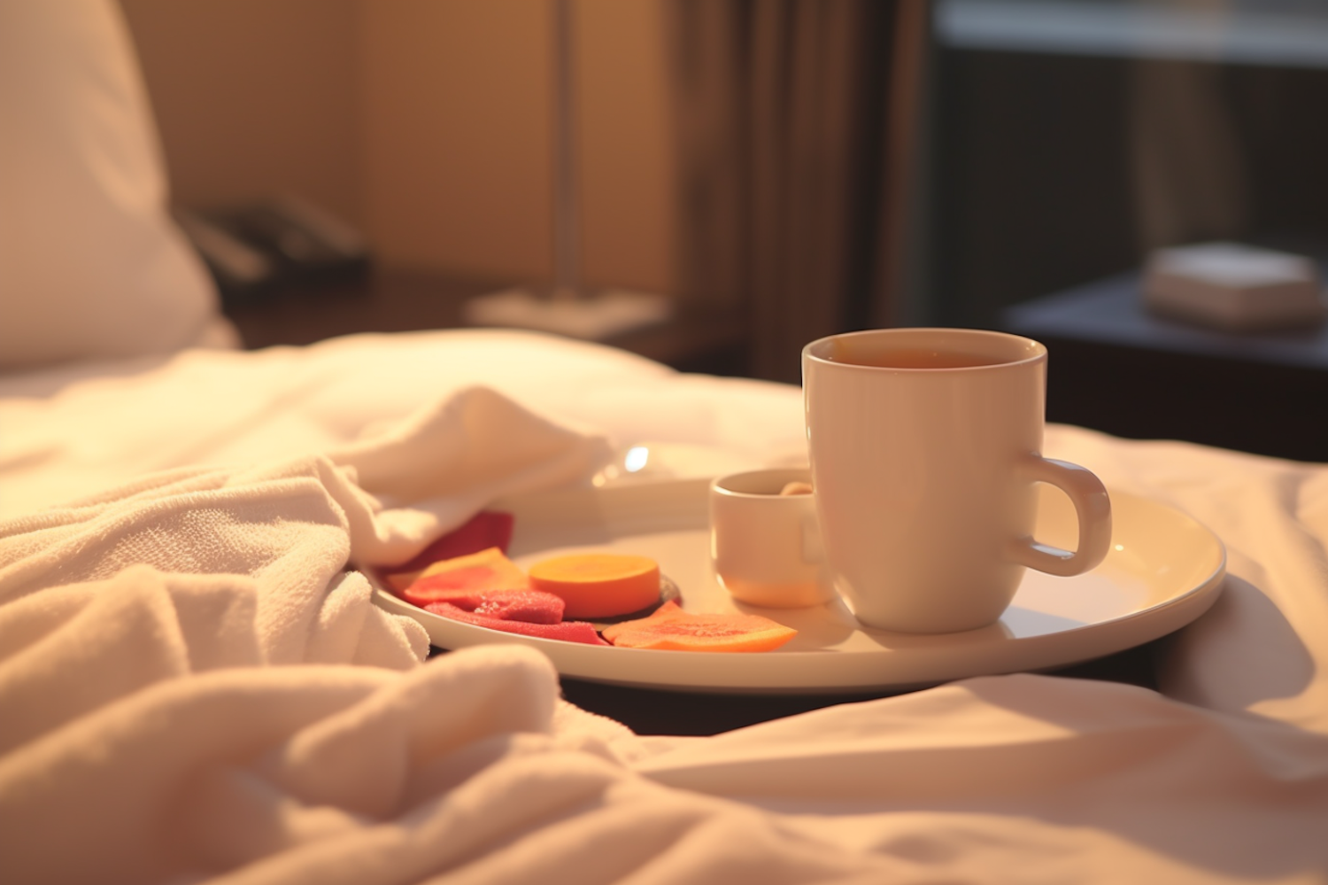Cozy breakfast in bed with a hot drink and fruit slices on a white tray, set against soft white linens.